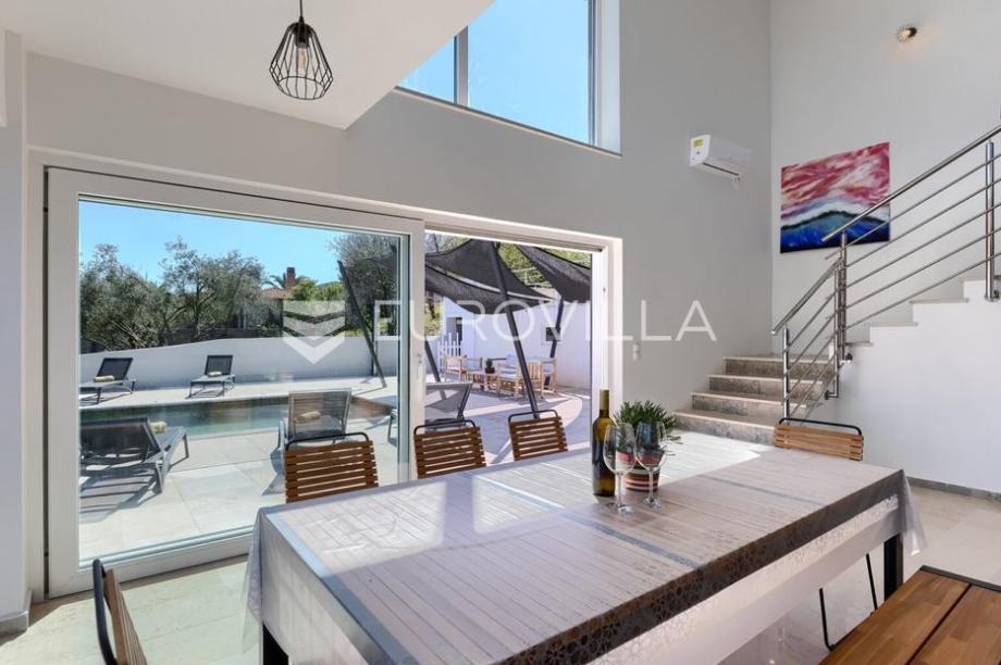 U simpatičnom naselju Ravni koje je udaljeno samo nekoliko kilometara od grada Labina smjestila se ova impresivna vila ukupne stambene veličine od 200 m2 na okućnici od 496 m2.Nekretnina se odlikuje modernim dizajnom, te su u izgradnji korišteni vrhunski i kvalitetni materijali, sami interijer ističe open space prostor s staklenim stijenama koje omogućuju konstantu prirodnu svjetlost i predivan pogled na more iz Vašeg budućeg dnevnog boravka.Vila se prostire na dvije etaže, prizemlje i prvi kat, prizemlje se sastoji od kuhinje s blagovaonicom, tri spavaće sobe, tri kupaonice i gostinjskog toaleta.Na katu se nalazi prostrani dnevni boravak, spavaća soba, kupaonica i gostinjski toalet.Okućnica je ambijentalno i hortikulturno uređena i ograđena a potpuni sklad pruža grijani bazen površine 38 m2 sa sunčalištem.Odlična prilika za investiciju u turističke svrhe ili miran obiteljski život.Za više informacija slobodno nas kontaktirajte....