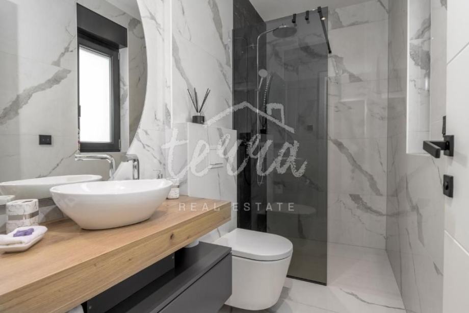 U prizemlju se nalazi kupaona, moderan dnevni boravak sa puno prirodnog svijetla, potpuno opremljena kuhinja i blagovaona s direktnim izlazom na lijepo uređenu okućnicu i grijani bazen idealan za opuštanje tokom cijele godine.