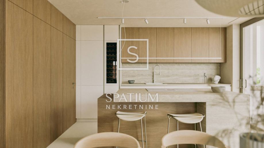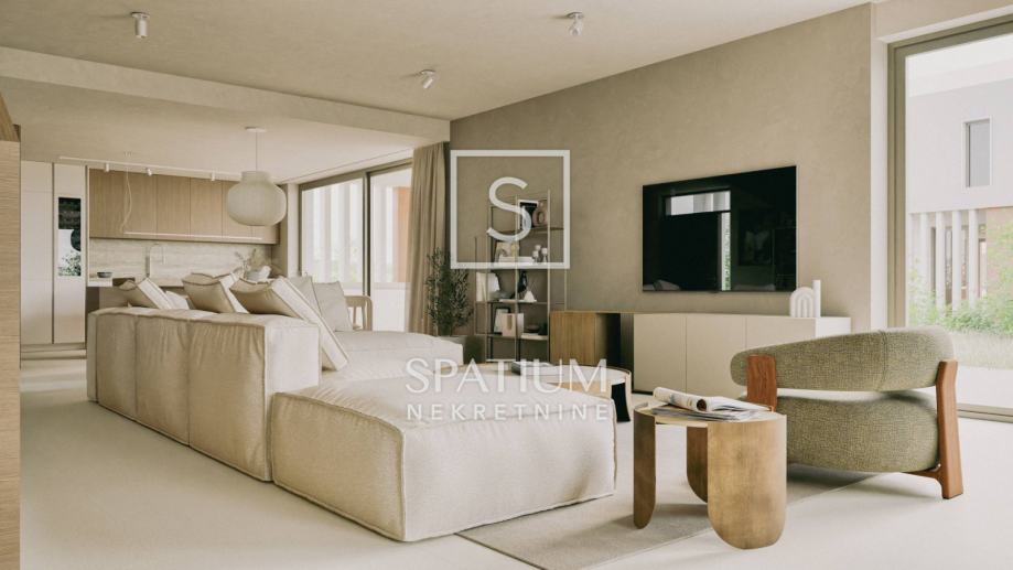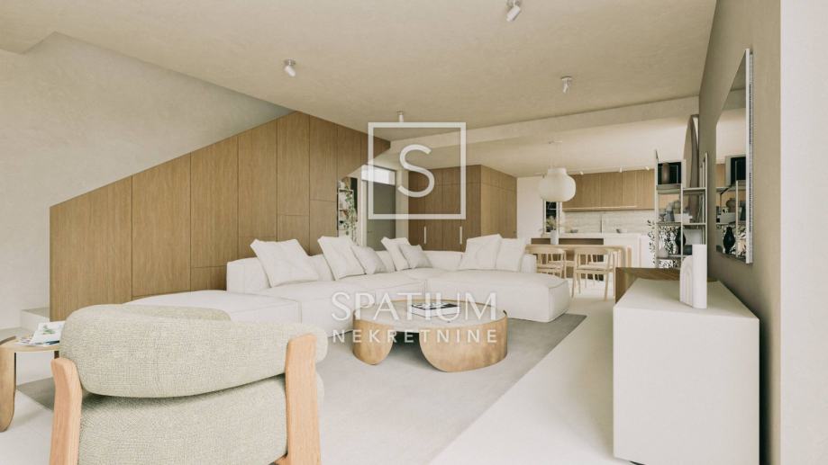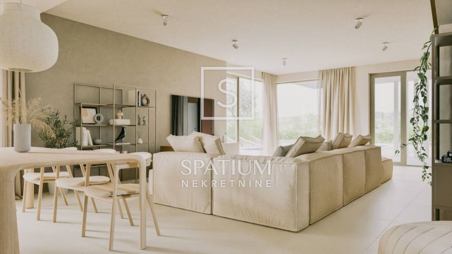 U prizemlju se nalazi veliki "open space" koncept dnevnog boravka, kuhinje i blagovaonice (66m2) iz kojega se izlazi na čak dvije natkrivene terase od kojih jedna ima bazen od 47m2 sa sunčalištem te dodatnom objektom u kojem se smjestila sauna, gym i dodatno spremište. Na okućnici uređenoj i ukrašenoj mediteranskim biljem nalaze se i tri natkrivena parkirna mjesta.