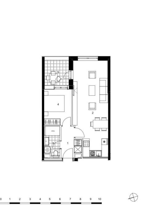 Stan je luksuzan, prekrasno uređen i odaje dojam toplog i mirnog prostora za stanovanje. Nalazi na 6. katu, orijentacije jugoistok, a sastoji se od ulaznog dijela, kupaonice, spavaće sobe, lođe te dnevnog boravka koji je povezan s kuhinjom i blagovaonskim dijelom.