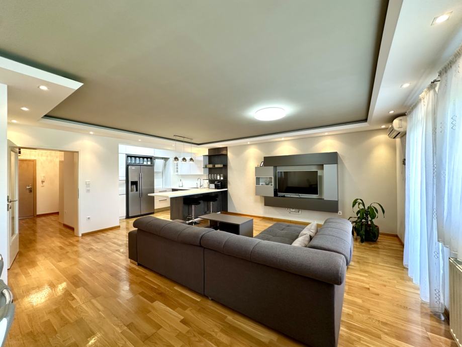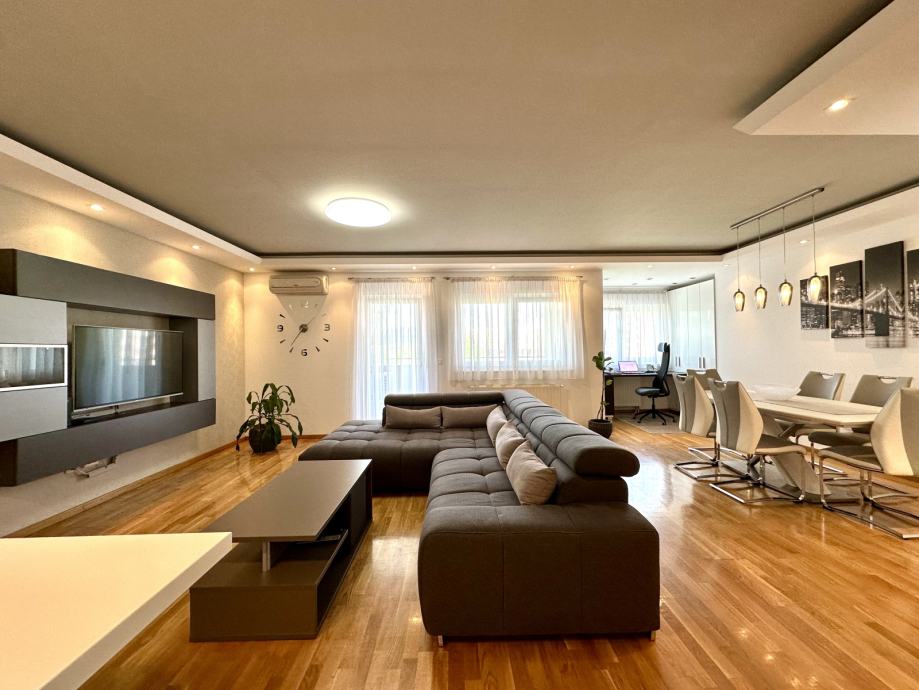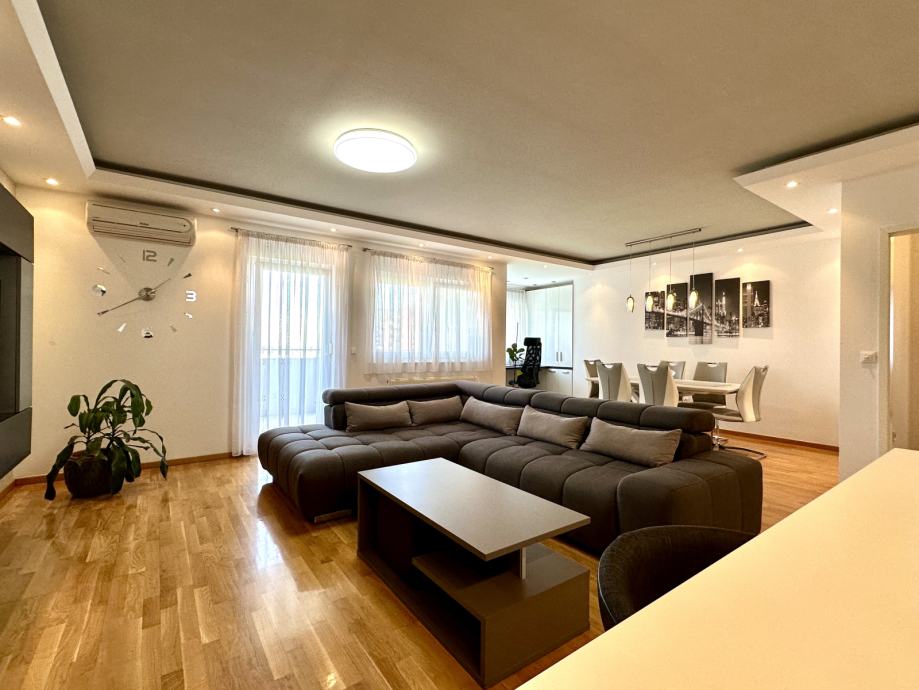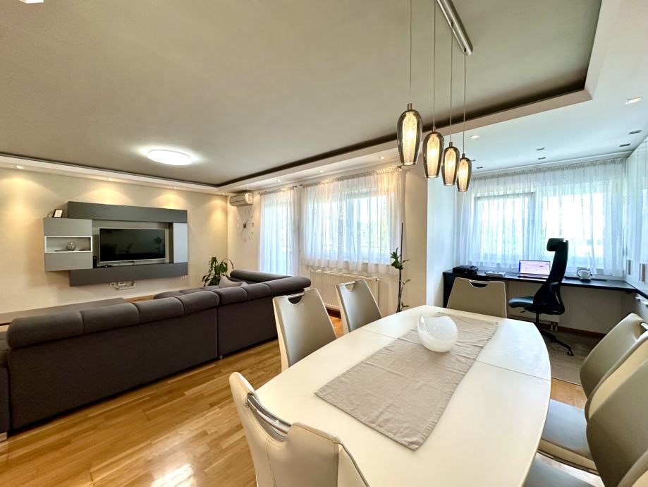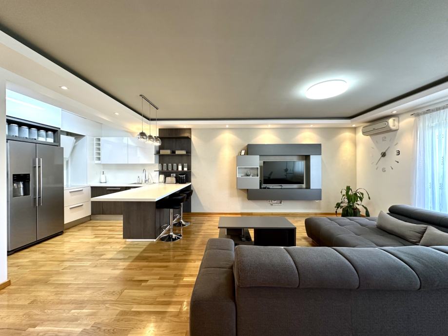 Stan je klimatiziran, PVC stolarija, spušten strop s LED rasvjetom, sav namještaj rađen po mjeri, opremljen vrhunskim kućnim aparatima.