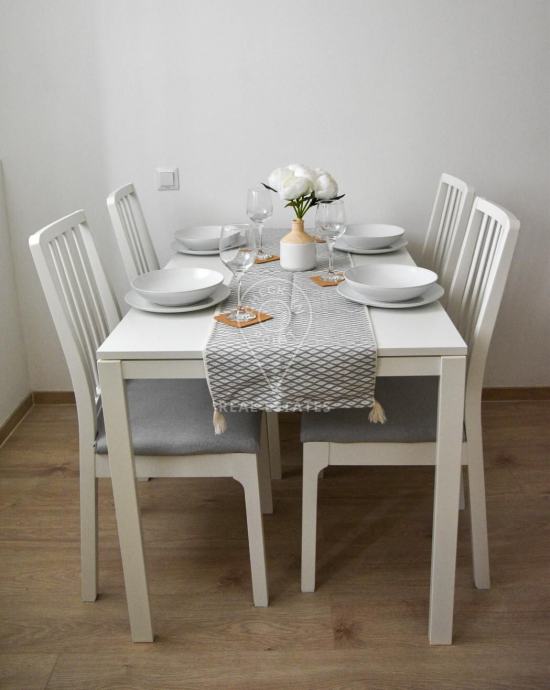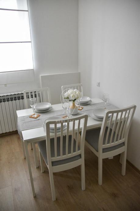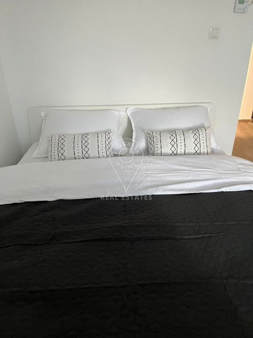 Stan se iznajmljuje u potpunosti namješten sa ugrađenom kuhinjom (perilica posuđa, hladnjak, pećnica, indukcijska ploča, posuđe i pribor za jelo), postavljenim klima uređajem i perilicom rublja, ugradbenim ormarima u prostoru predsoblja i spavaće sobe, novim bračnim krevetom i madracem.