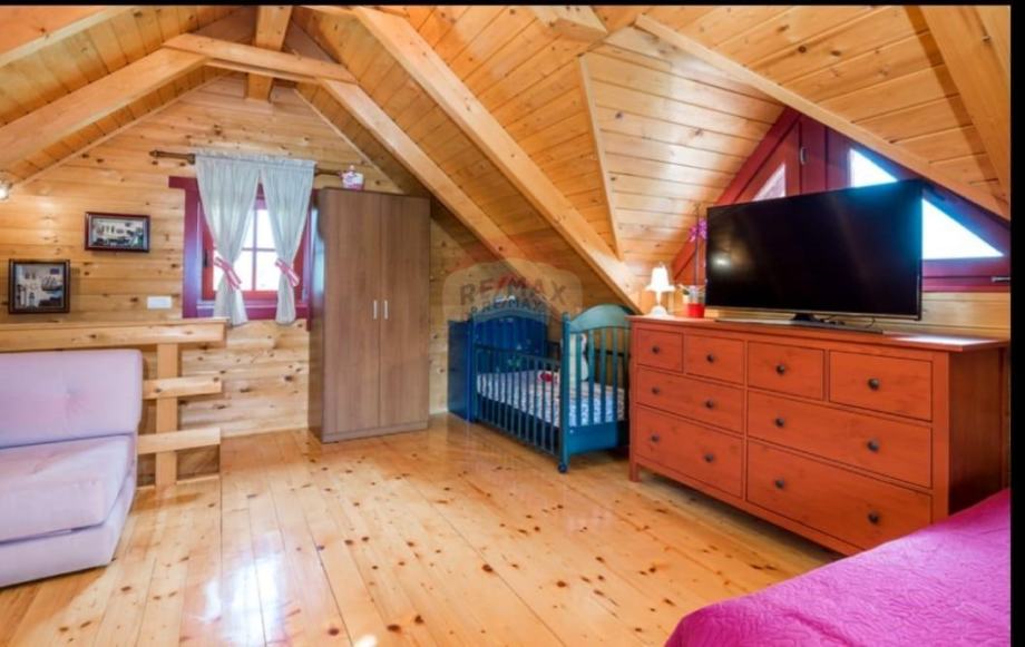 Prizemlje kuće sadrži kuhinju s blagovaonicom i dnevni boravak koji izlazi na natkrivenu terasu od 15 m². Na katu je kupaonica i prostrana spavaća soba s balkonom, a može primiti do četiri osobe. Kuća se prodaje potpuno namještena, uz mogućnost kupnje susjedne kuće sličnog stila. Uz samu nekretninu nalazi se i dodatno građevinsko zemljište od 1.000 m², idealno za proširenje.