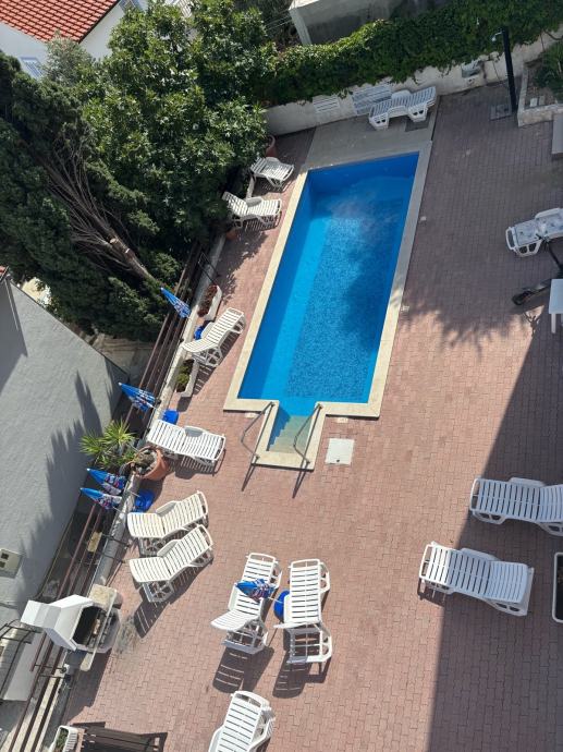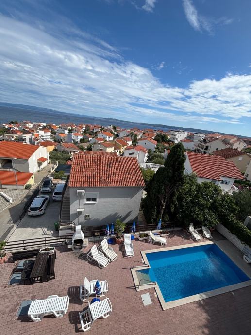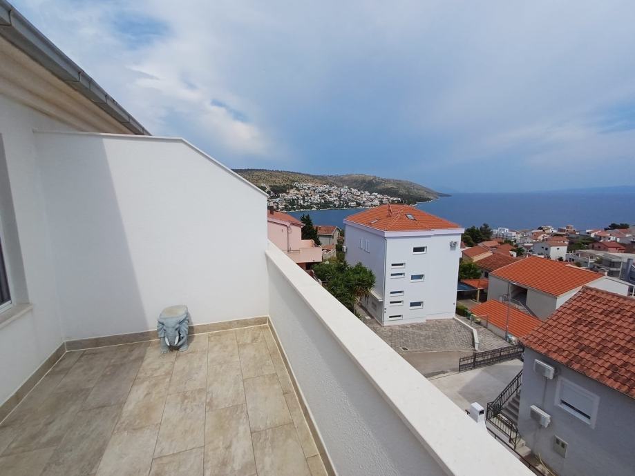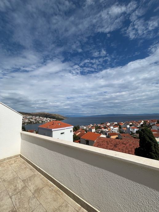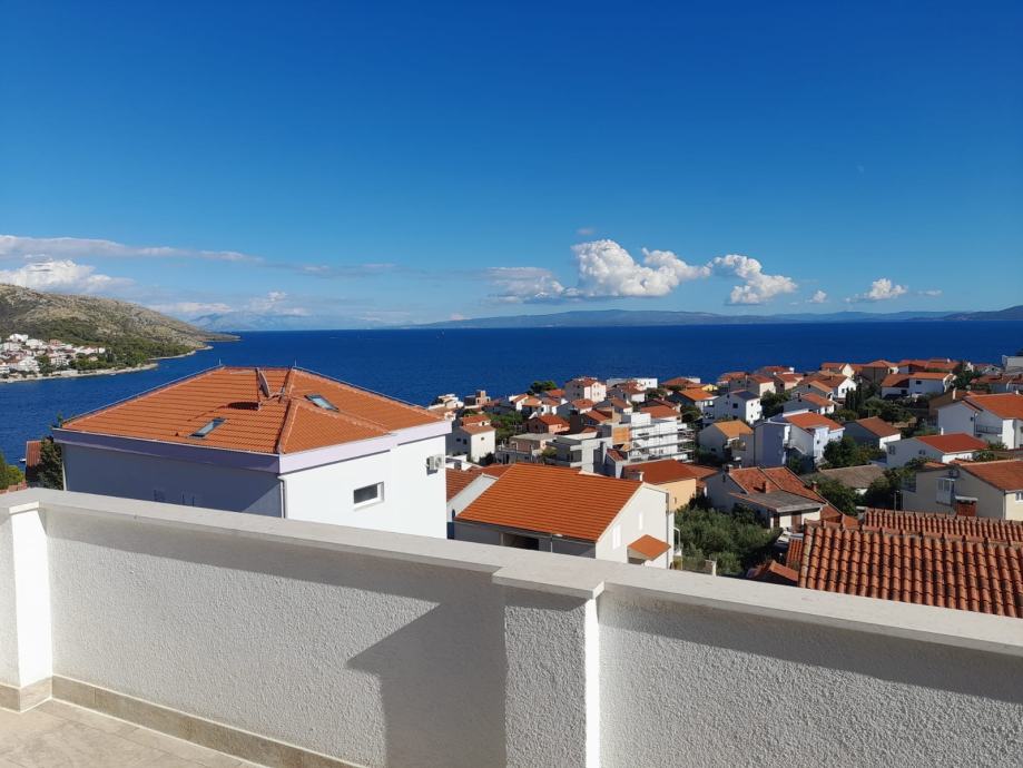 We are selling a beautiful two-story apartment with a beautiful open view of the sea! It is a comfortable two-bedroom apartment with a gallery and a large terrace with a view. The apartment has 79.39m2, and consists of a bedroom with its own toilet, a kitchen with a dining area and a living room from which you can exit to a beautiful large terrace with an open view of the sea and islands, stairs lead to the gallery on the first floor where there is another room. There is also a swimming pool within the building that residents have the right to use! The apartment is an exceptional potential for those who want to engage in tourism and renting, but also a very pleasant and peaceful place for year-round living! Trogir is only 10 minutes by car, close to the airport and all necessary amenities. Local shops nearby and beautiful beaches! The price is €280,000. CONTACT: 0915616295 (ANDREA)