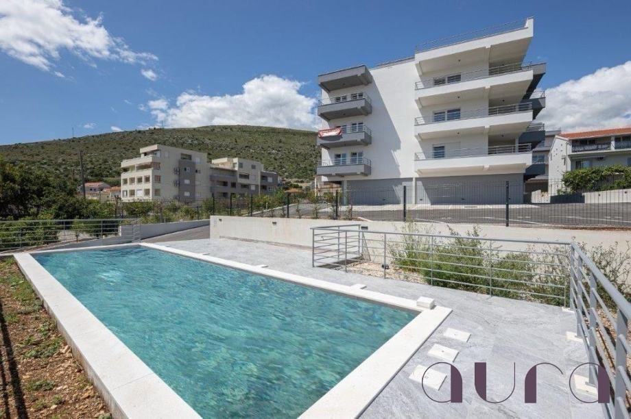 Dugoročno se iznajmljuje kompletno opremljen jednosoban stan smješten na drugom katu novogradnje s liftom u Segetu Donjem. Ima prekrasan otvoren pogled na more. Stan ima 54m2, a sastoji se od jedne spavaće sobe, kupatila, kuhinje sa blagovaonom i dnevnog boravka iz kojeg se izlazi na terasu s pogledom na more. Stan je orijentacije zapad. Radi se o potpunom novom stanu, novoj zgradi. Zgrada ima bazen koji također mogu koristiti budući Najmoprimci. Stanu pripada i garažno parkirno mjesto pokraj kojeg je odmah lift koji vodi direktno do ulaznih vrata stana. Lokacija je izuzetno mirna, a opet u neposrednoj blizini se nalaze svi potrebni sadržaji, a poznati grad Trogir svega nekoliko minuta autom …