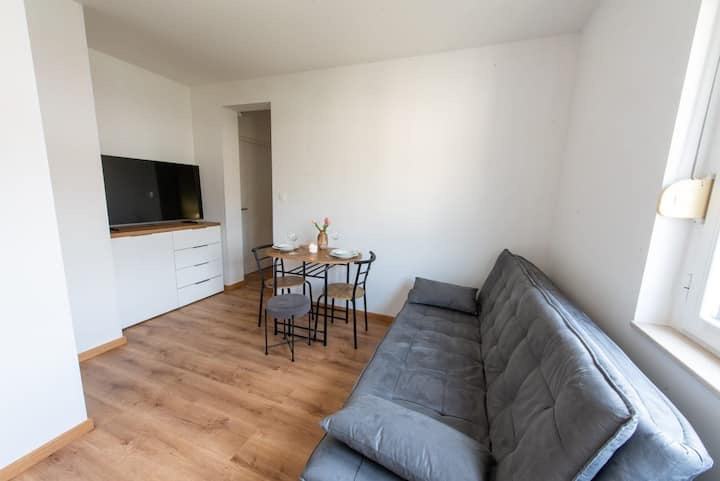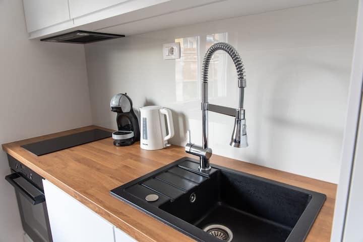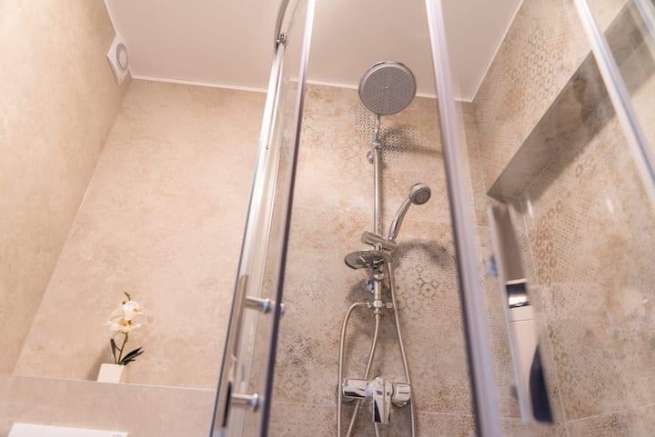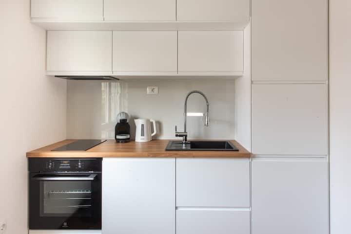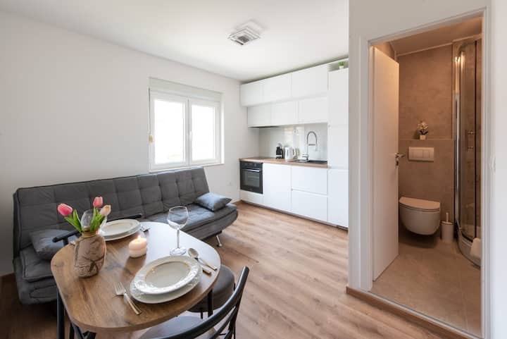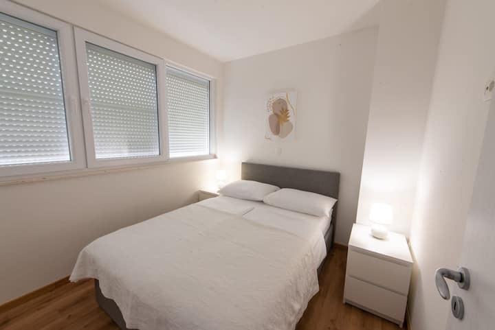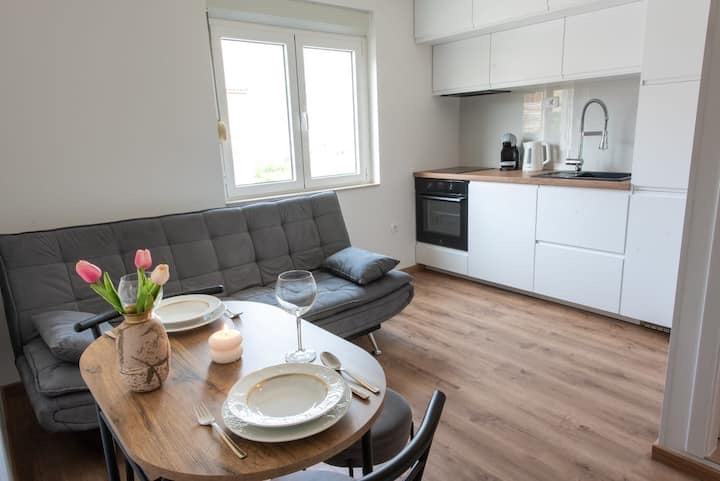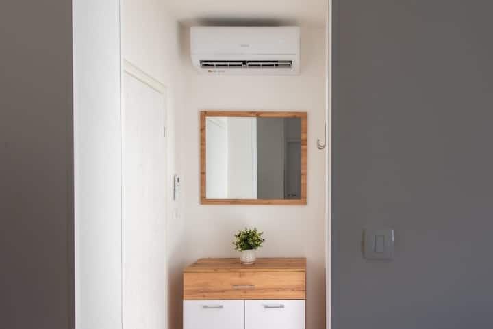 We are renting a beautiful, completely new one-bedroom apartment located on the second floor of a family house in an extremely quiet environment. A pleasant, newly renovated apartment located in a spacious yard with secured parking. A quiet and pleasant environment close to all recreational and tourism facilities. There is a bedroom with a double bed (140×200), a wardrobe, a kitchen and a living room in one room and a bathroom. The kitchen is equipped with all the necessary amenities as well as a pantry. In the living room there is a sofa bed that is suitable for comfortable sleeping. The monthly rental price is €550. CONTACT: 0915616295 (ANDREA)