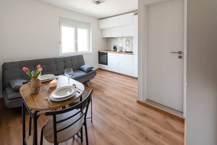Posredujemo u najmu lijepog kompletno novog jednosobnog stana smještenog na drugom katu obiteljske kuće u izuzetno mirnom okruženju. Ugodan, novouređeni stan koji ima prostrano dvorište s osiguranim parkingom.