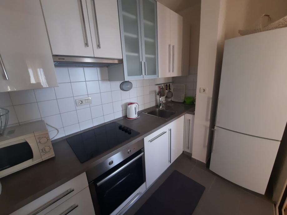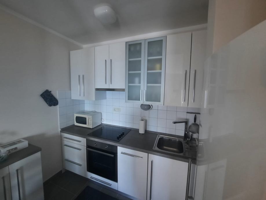 For long-term rent, a beautifully decorated apartment with a view of the sea, located on the ninth floor of a building in Trstenik. The apartment is 42 m2 and is completely south-facing. Near the apartment there are all the necessary amenities, and the sea is a 10-minute walk away.