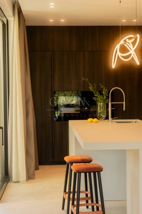 Kuća je građena suvremenim i održivim materijalima, s naglaskom na kvalitetu i estetiku. Interijer je opremljen vrhunskim talijanskim brendovima (Novamobili, DallAgnese, Copat, Silestone, Slamp, Rotaliana…), a raspored prostorija osmišljen je za maksimalnu udobnost i funkcionalnost.