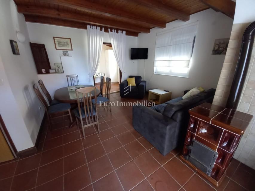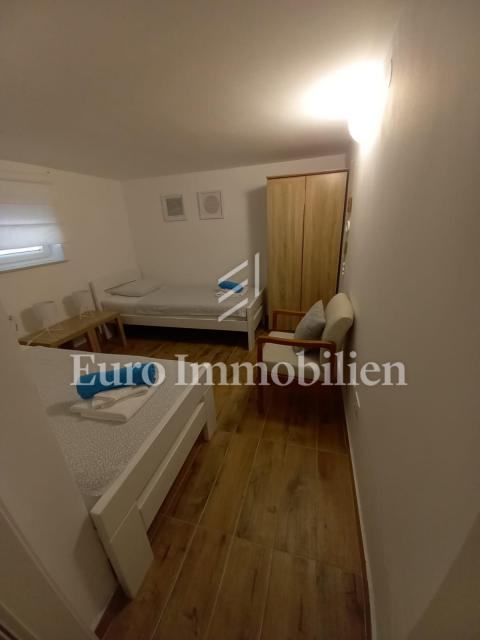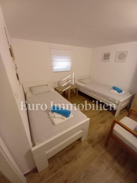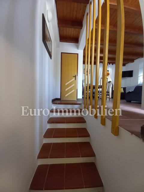 Ukupna stambena kvadratura nekretnine je 74 m2. Podijeljena je na suteren, prizemlje i prvi kat. U suterenu se nalazi spavaća soba, vešeraj te kupaonica. Unutarnjim stepenicama dolazi se u prizemlje koje se sastoji od kuhinje s blagovaonicom te izlazom na okućnicu na kojoj se nalazi bazen, sunčalište, zidani roštilj te prostor za druženje s prijateljima i obitelji. Unutarnjim stepeništem dolazi se na kat gdje se nalazi još jedna spavaća soba. Kuća je kompletno namještena, opremljena i klimatizirana te se kao takva i prodaje. Pripadaju joj i dva parkirna mjesta na okućnici. Nekretnina se nalazi na odličnoj lokaciji koja osigurava mir za idealan odmor. Udaljena je cca 4,5km od plaže i mora. Za više informacija i ogled nekretnine, kontaktirajte nas!