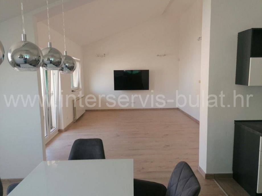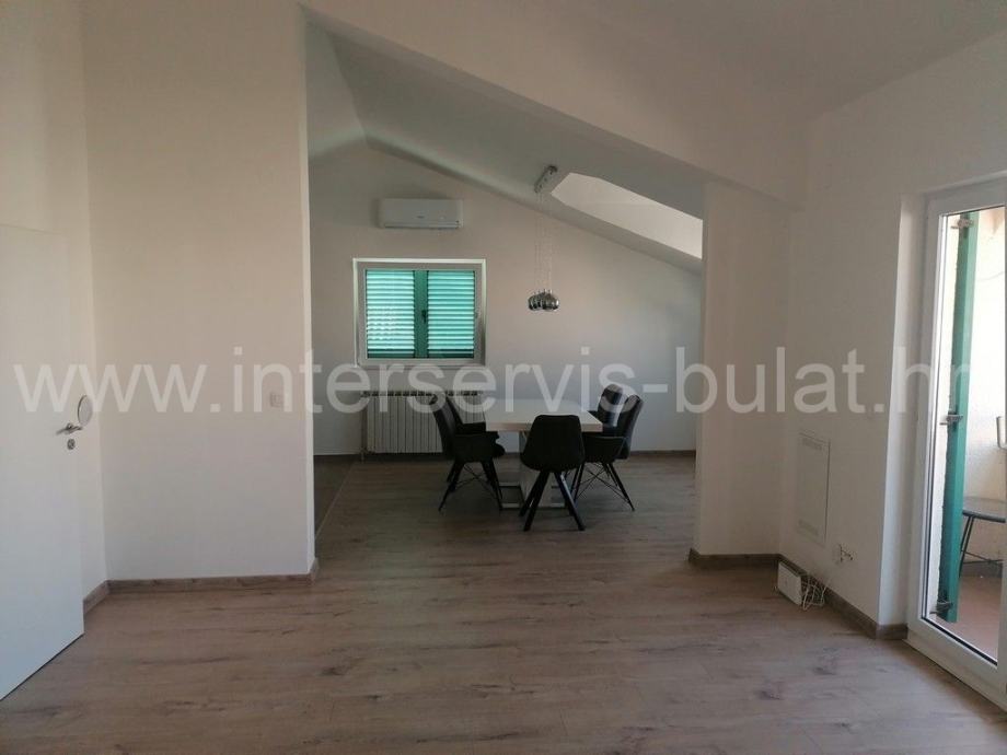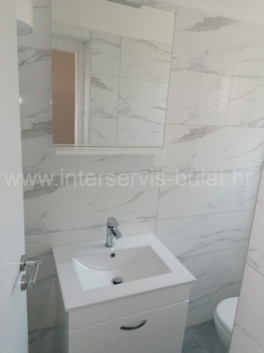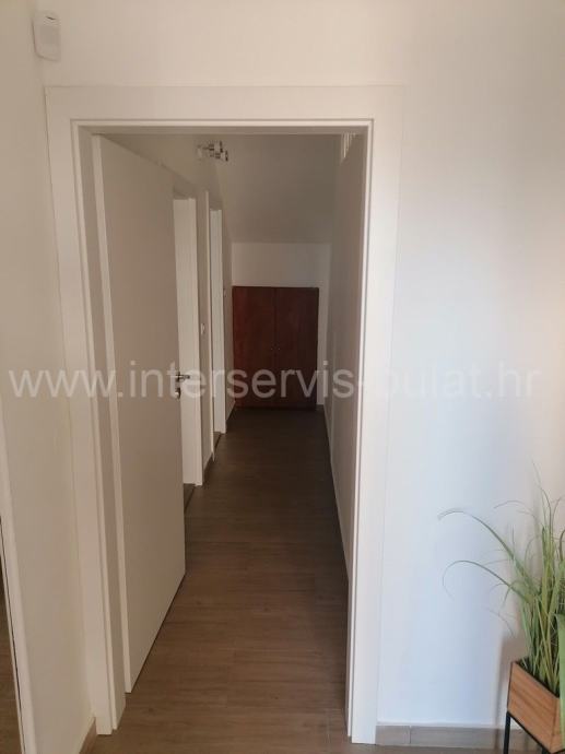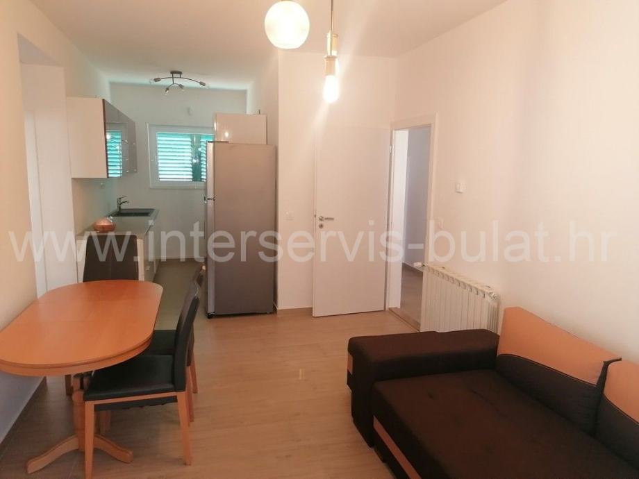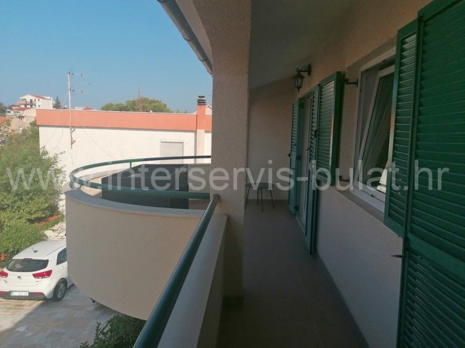 Na svega 95m udaljenosti od mora nalazi se kuća sa dva stana. U prizemlju se na oko 112m2 nalazi komforan trosoban stan uz dodatak terase. Posebnim ulazom i unutarnjim stepenicama penjemo se na kat gdje nalazimo prostran dvosoban stan iste stambene površine kao i stan u prizemlju, ali sa dvije kupaonice. Pripada mu terasa površine 25m2 sa malim pogledom na more. Oba stana su uređena, održavana i useljiva.