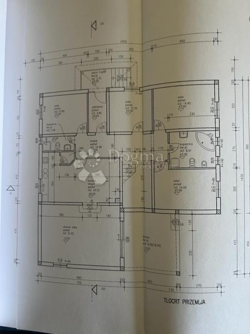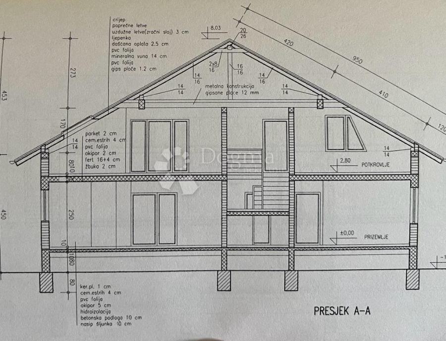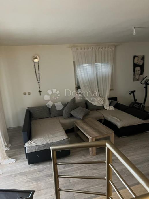 Kuća se sastoji od 3 etaže , podrum gdje je predviđena garaža te dvije zasebne prostorije koje se mogu koristiti kao ostava, vešeraj ili sl. , u suterenu je jedan uređen stan koji se sastoji od 4 spavaće sobe, dnevnog boravka, kuhinje, blagovaone, kupaonice te vešeraj ( instalacije pripremljene za kupaonicu) te terase. Na katu je još jedan stan roh bau sa pregradnim zidovima te je predviđeno kao dnevni boravak, kuhinja, blagovaonica, kupaonica, te 4 spavaće sobe.