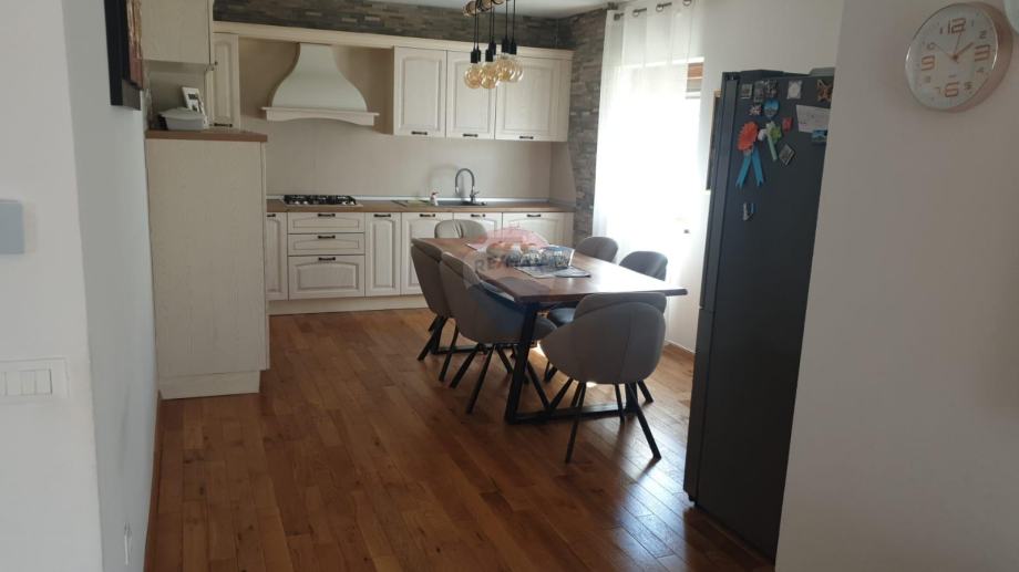 U prizemlju se nalazi stan od 118m2, s dvije spavaće sobe, dnevnim boravkom s kaminom, dvije kupaonice, dvije spavaće sobe i kuhinja s blagovaonom, iz stana se