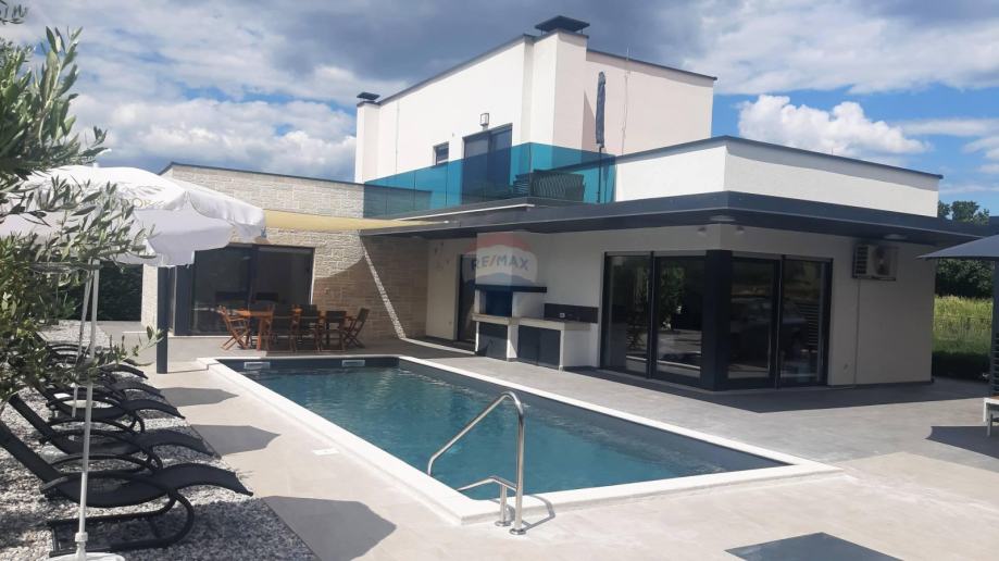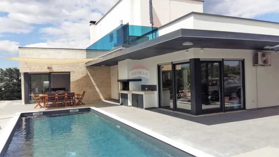 Lijepo uređena moderna kuća sa bazenom u okolici VIšnjana. Kuća se nalazi na parceli površine 851m2. Sastoji se od tri etaže, podruma, prizemlja i kata.