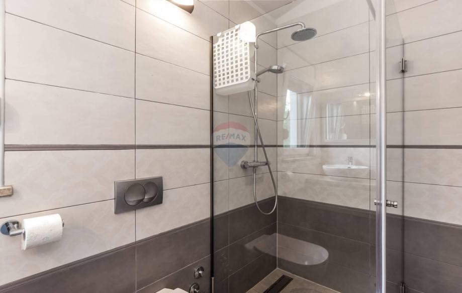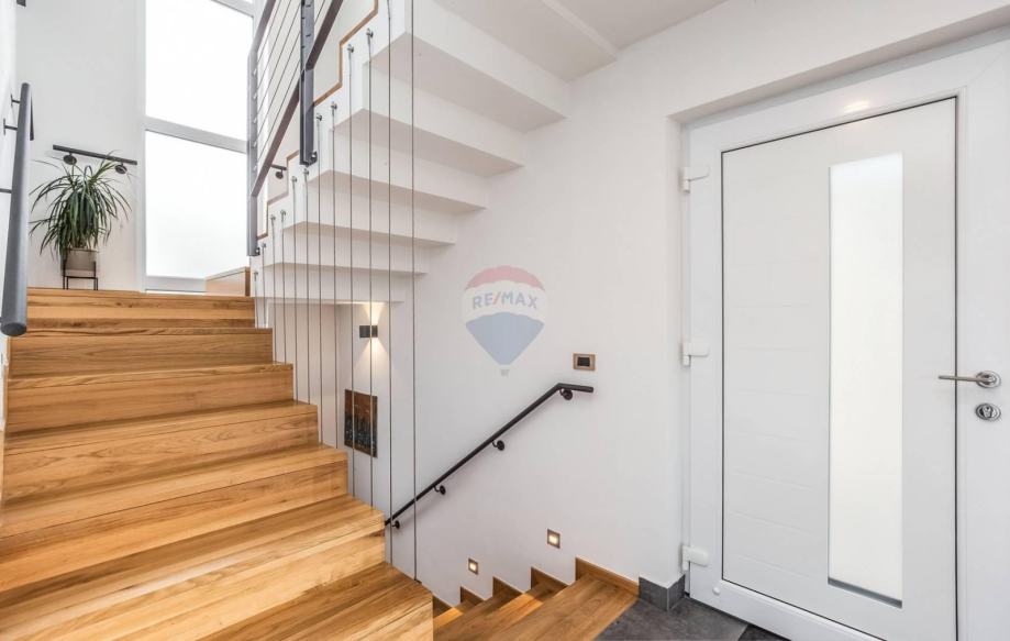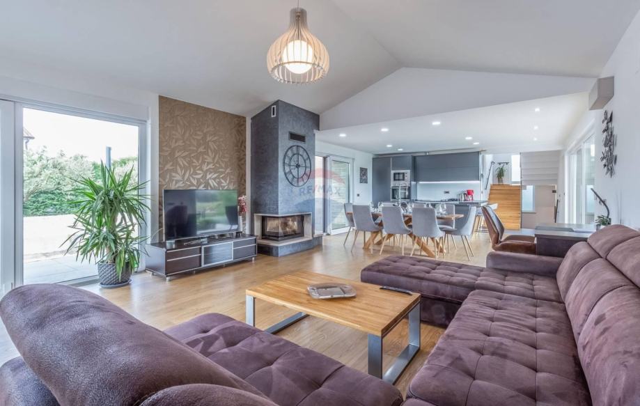 U podrumu se nalazi lijepo uređena konoba sa kaminom, prostorija za fitnes i kotlovnica. U prizemlju se nalazi dnevni boravak sa kuhinjom i blagovaonom otvorenog koncepta sa kaminom