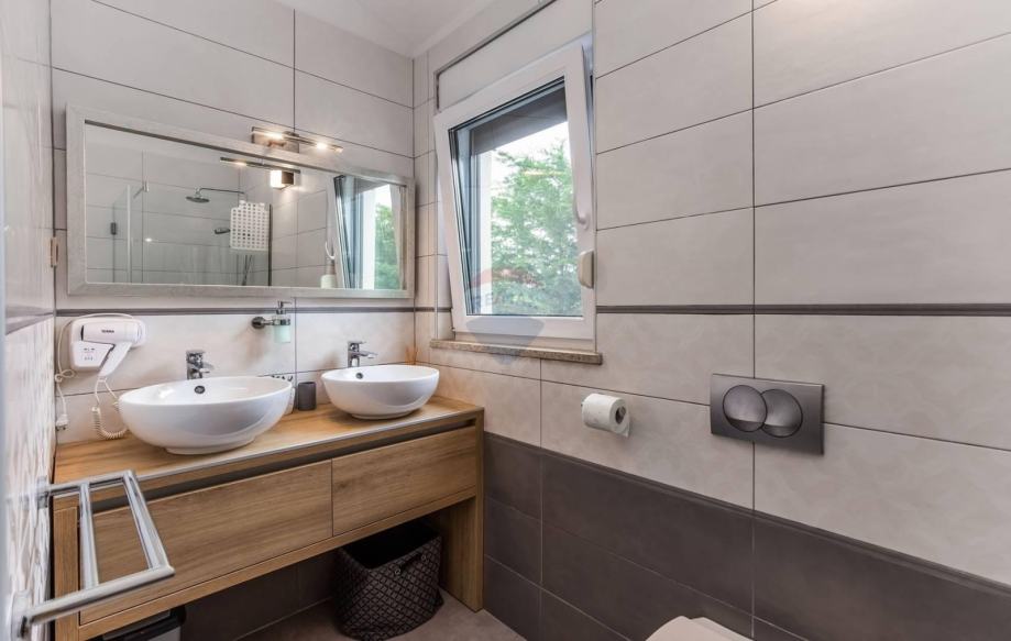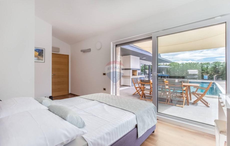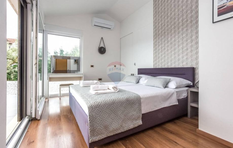 i velikim staklenim stijenama kroz koje se pruža prekrasan pogled na bazen s jedne i predivni prirodni okoliš s druge strane. U prizemlju se još nalaze i dvije spavaće sobe svaka sa svojom