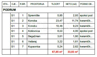 Kuća se sastoji od podruma, prizemlja i prvog kata, podrum ima kupaonu, vešeraj, dvije konobe, kotlovnicu i spremište.