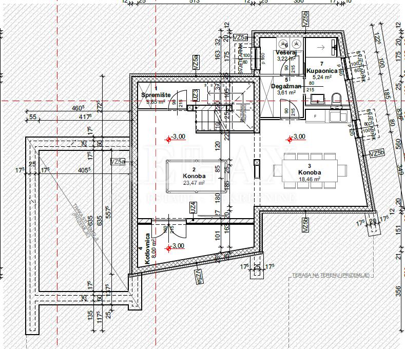 U prizemlju se nalazi natkriveni ulaz koji dovodi do hodnika iz kojega se ulazi u prostrani dnevni boravak sa staklenom stijenom koja je ujedno i izlaz na natkrivenu terasu koja se nalazi ispred bazena. Kuhinja i blagovaona su odvojene od dnevnog boravka i također imaju staklenu stijenu i izlaz na terasu te daje puno svjetlosti i topline domu. Prizemlje još ima i kupaonu te jednu prostoriju koja može biti soba za druženje ili nešto po želji i isto ima izlaz na terasu s bazenom.
