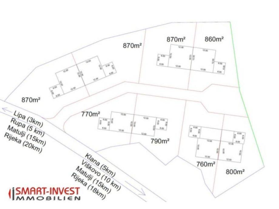 LIPA, zemljište površine 9000 m2 od čega je 6700 m2 građevinsko, a 2300 m2 zeleni pojas. Mogućnost gradnje više obiteljskih kuća (na slikama su prikazane 2 varijante izgradnje). Za sve ostale inf. nazovite 099/320-0008