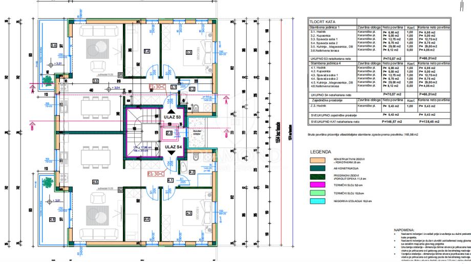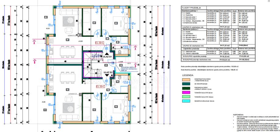 Prizemlje se sastoji od 2 stana, svaki neto površine 66,98 m². Svakom stanu pripadaju: 2 terase, vlastiti vrt (74 m² i 90 m²), 1 parkirno mjesto