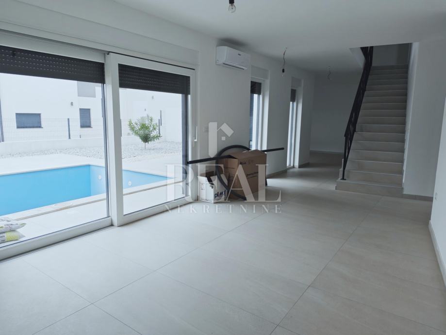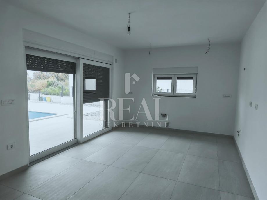Bazen veličine 6x4m2 postavljena priprema za grijanje,udaljenost od plaže 1500m.Planiran završetak početkom 4 mjeseca.Kuća je na firmu i u sustavu Pdv-a.