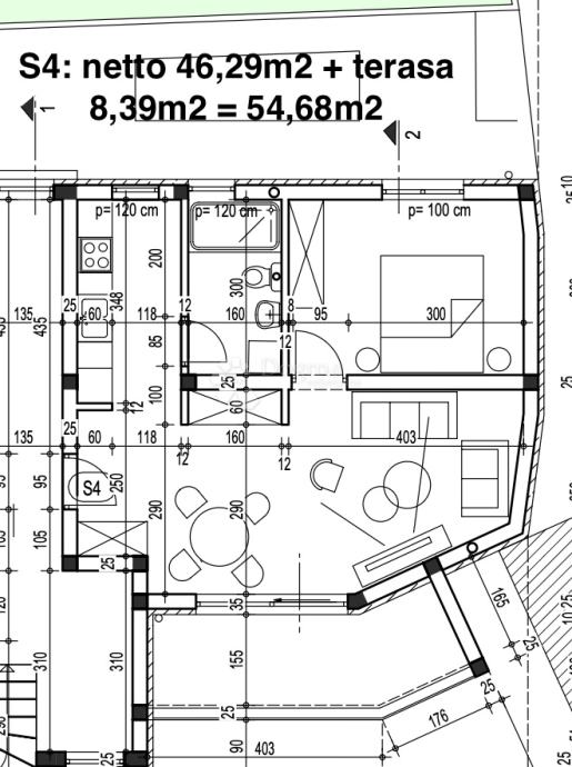Unutarnja stambena površina iznosi 46,29 m², dok ukupna površina s terasom iznosi 54,68 m².