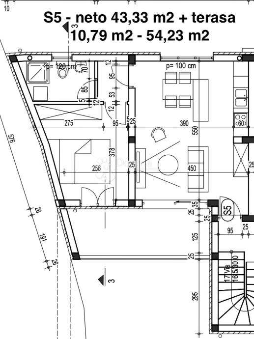 Unutarnja stambena površina iznosi 43,33 m², dok ukupna površina s terasom iznosi 54,23 m².