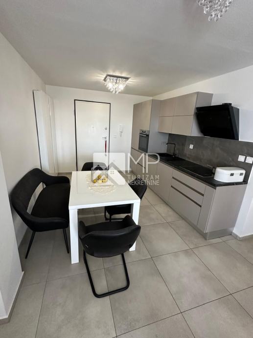 kuhinja s blagovaonicom i dnevnim boravkom sa izlazom na natkrivenu terasu gdje se prostire otvoreni pogled na more, kupaonice i dvije spavaće sobe.