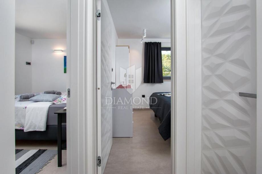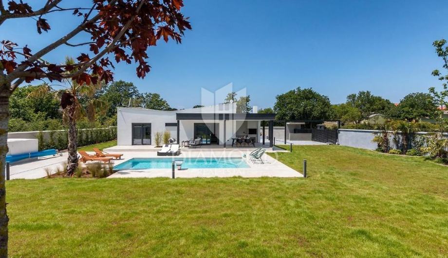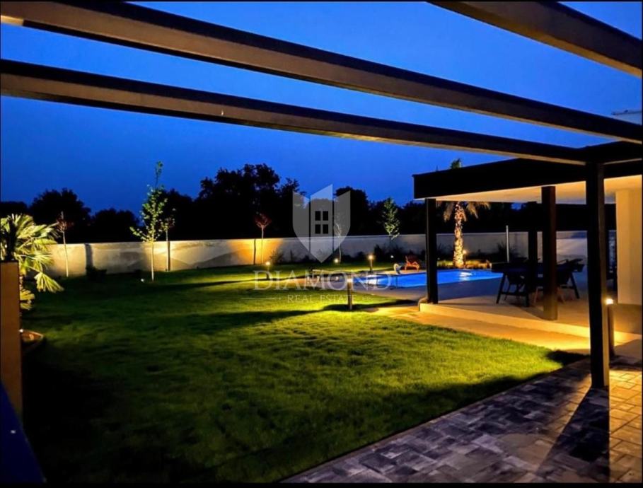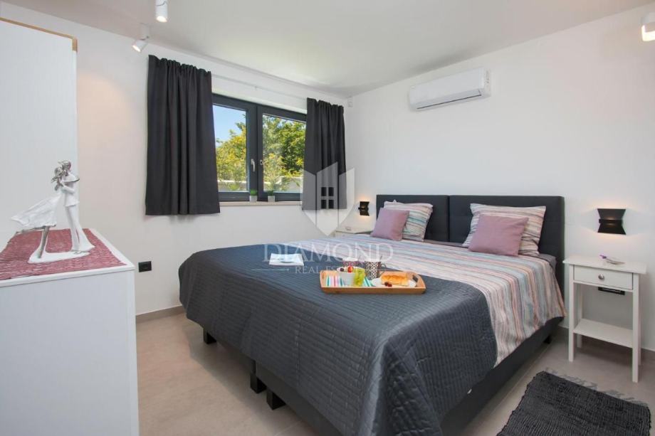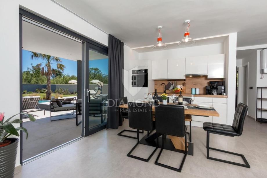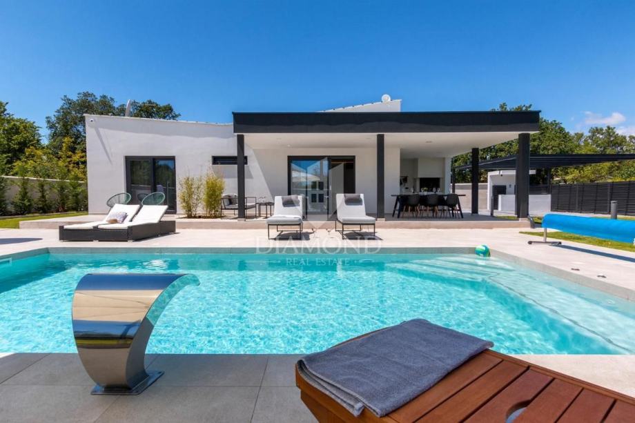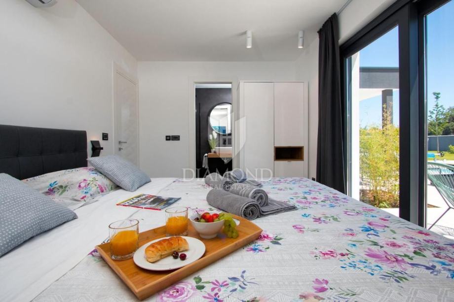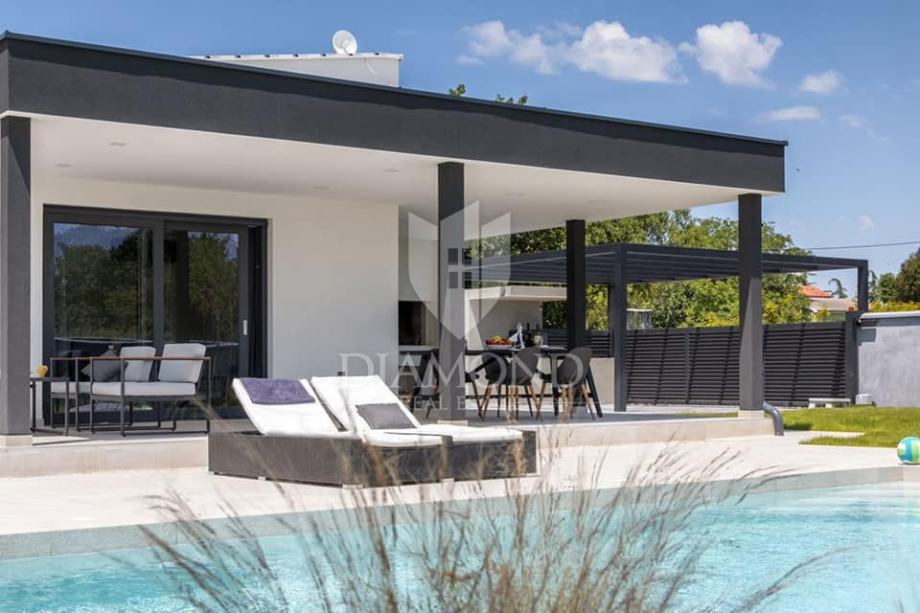 Smještena na svega nekoliko kilometara do prve plaže i svih potrebnih sadržaja za luksuzan odmor, nalazi se ova prizemnica modernog dizajna. Ukupne kvadrature 70 m2 obuhvaća komforan dnevni boravak sa blagovaonicom, potpuno opremljenu kuhinju, dvije spavaće sobe te dvije kupaonice. Kuća ima postavljene klima uređaje u svim prostorijama a provedeno je i podno grijanje na struju kroz cijelu nekretninu a opremljena je modernim i funkcionalnim namještajem. Dnevni prostor povezan je sa vanjskom natkrivenom terasom gdje se nalazi ljetna kuhinja i prostor za blagovanje s pogledom na bazen i okućnicu.