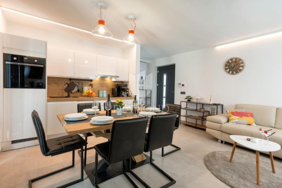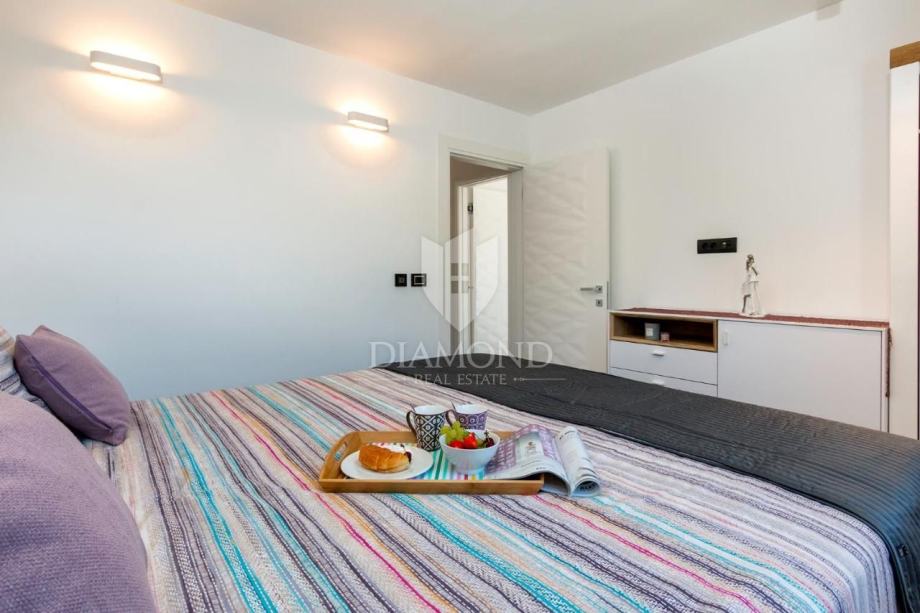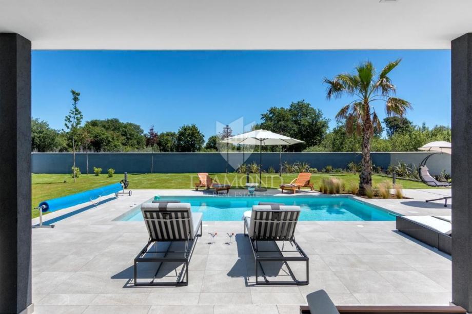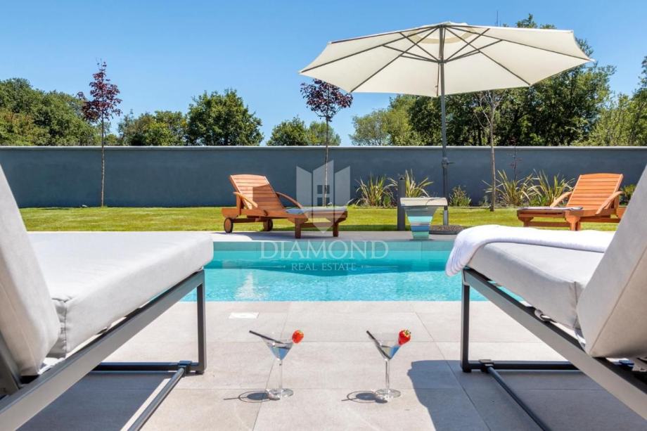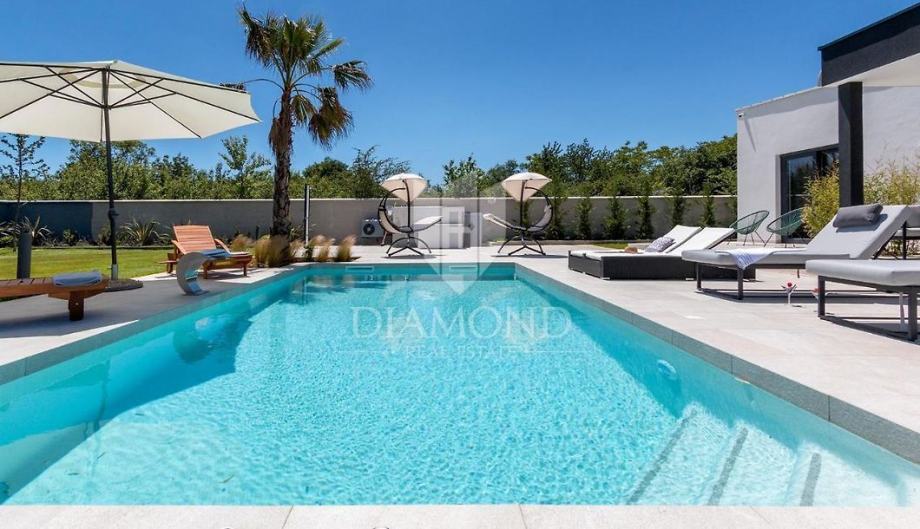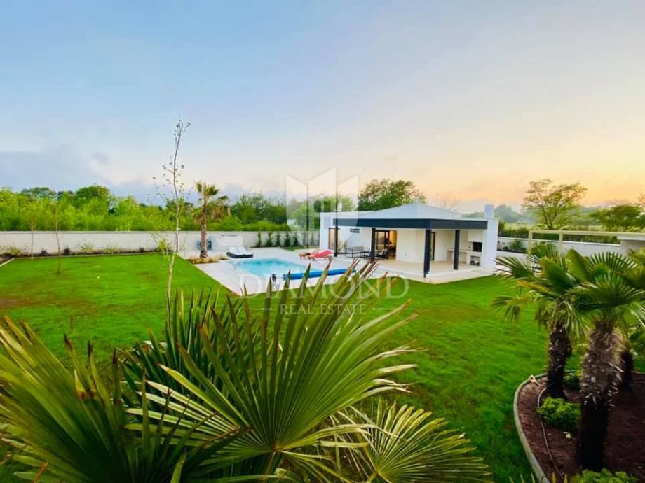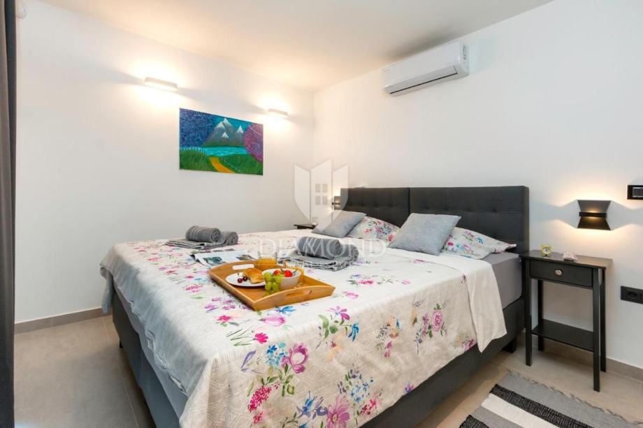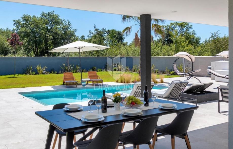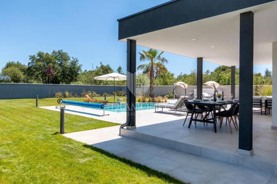 Smještena na svega nekoliko kilometara do prve plaže i svih potrebnih sadržaja za luksuzan odmor, nalazi se ova prizemnica modernog dizajna. Ukupne kvadrature 70 m2 obuhvaća komforan dnevni boravak sa blagovaonicom, potpuno opremljenu kuhinju, dvije spavaće sobe te dvije kupaonice. Kuća ima postavljene klima uređaje u svim prostorijama a provedeno je i podno grijanje na struju kroz cijelu nekretninu a opremljena je modernim i funkcionalnim namještajem. Dnevni prostor povezan je sa vanjskom natkrivenom terasom gdje se nalazi ljetna kuhinja i prostor za blagovanje s pogledom na bazen i okućnicu.