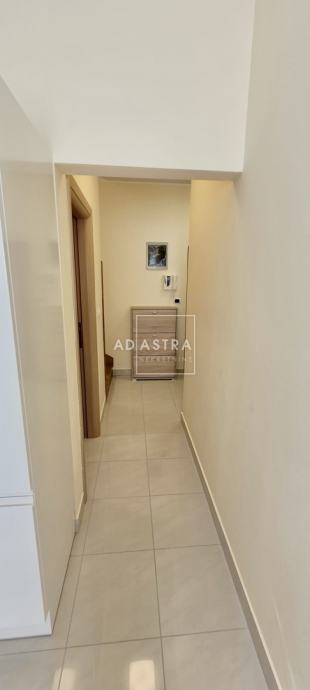 Stan je podijeljen na dvije razine - kat i međukat. Prva razina stana sastoji se od kupatila s tuš kadom, spavaće sobe te prostranog dnevnog dijela s kuhinjom i blagovaonom s izlazom na natkrivenu terasu s prekrasnim panoramskim pogledom na more.