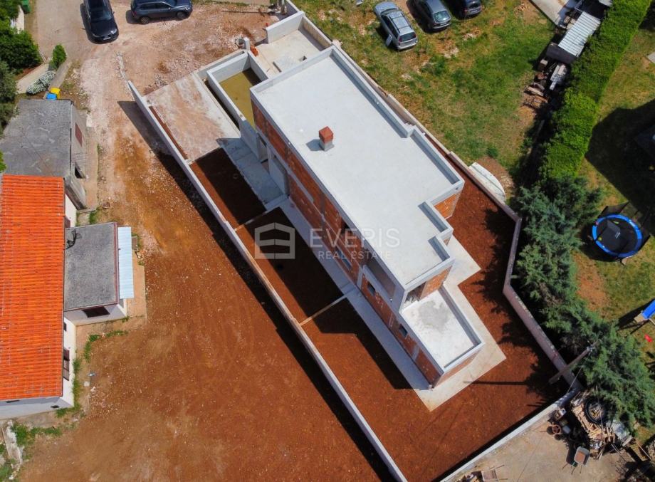 Kuća s bazenom veličine 30m2 gradi se i prodaje po sistemu. "ključ u ruke". Kuća sa pogledom na more (i sa prizemlja). Grijanje je podno na struju, a u kući će biti postavljene tri inverter klime (po spavaćim sobama i jedna u dnevnom boravku). Postavljanje fasade (stiropor 10cm) se planira za početak 9.mjeseca 2025.godine. Budući vlasnik ima na izbor keramiku do 30eura/m2 (sve iznad, po vlastitom trošku).