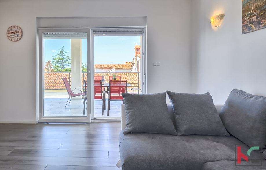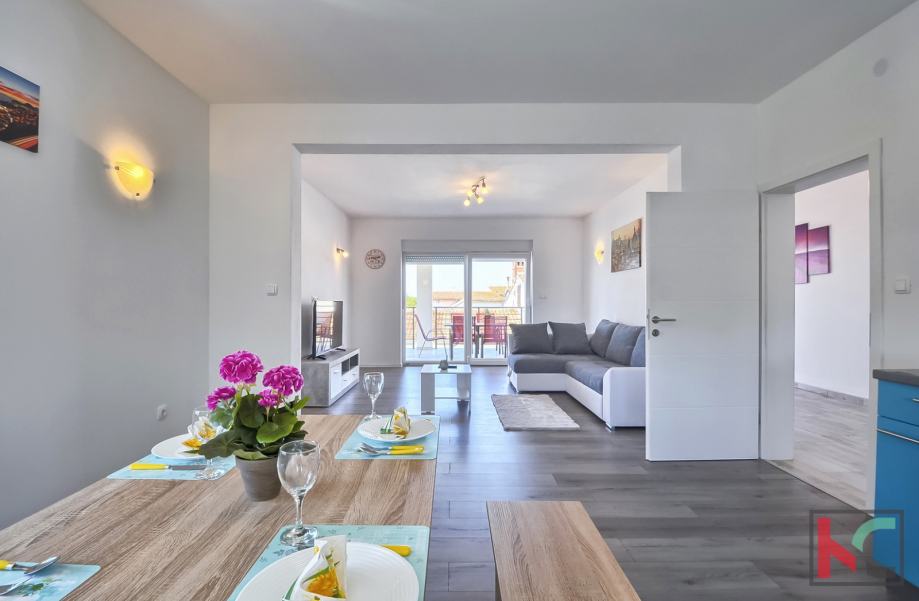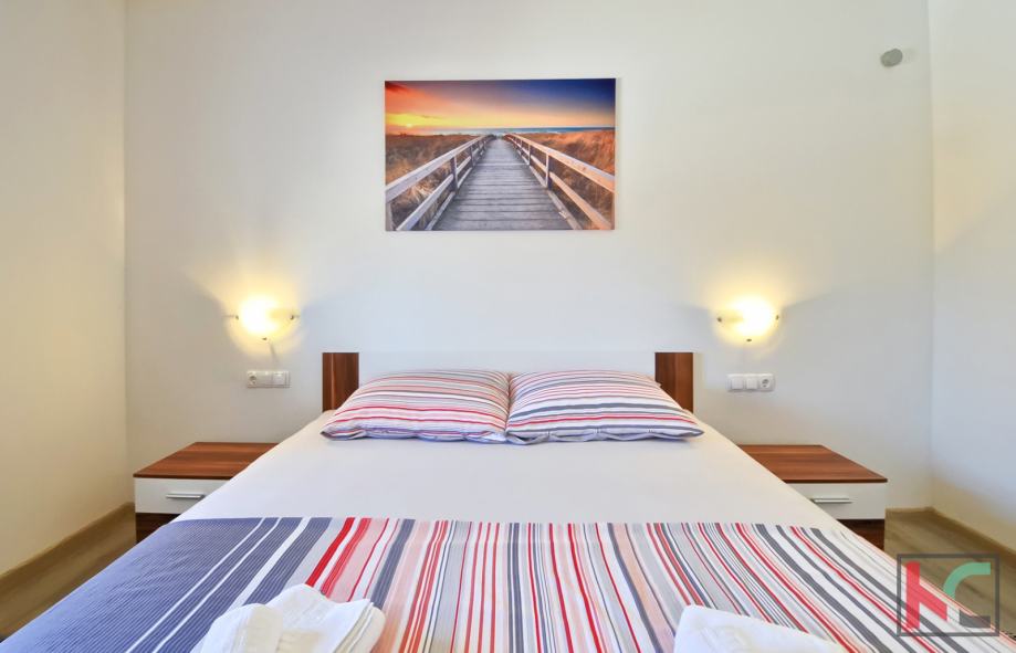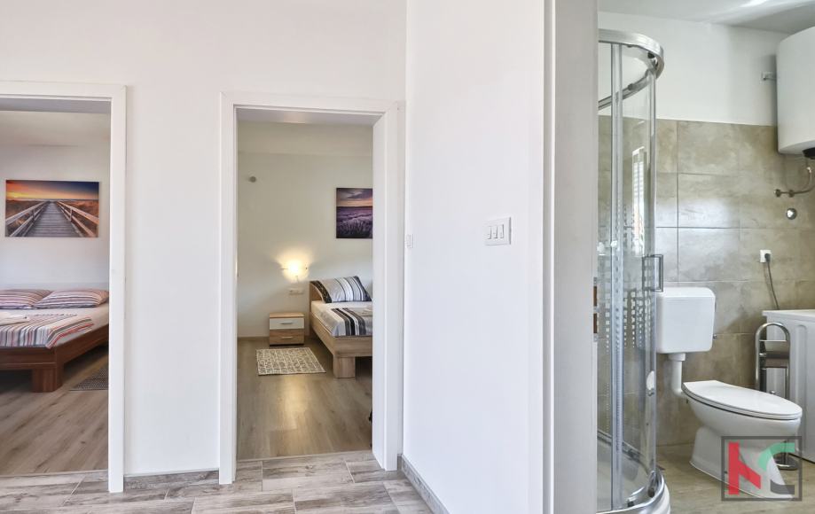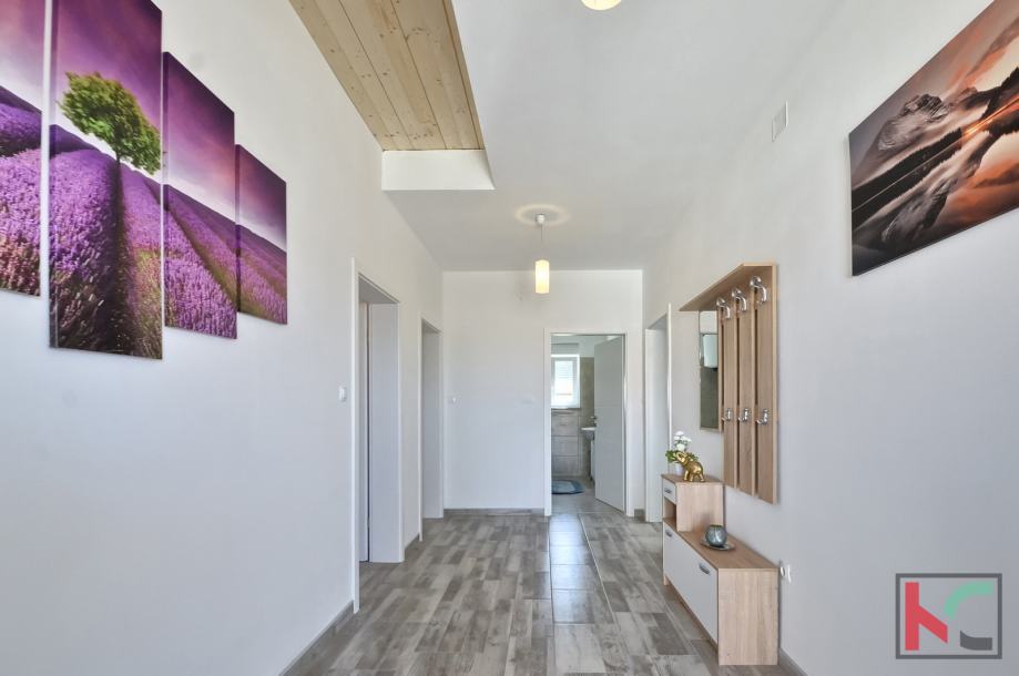 Stambene je površine 150m2, te se nalazi na drugom katu, dvoetažni je i sastoji se od kata i mansarde. Prva etaža sadrži dvije prostrane spavaće sobe, veliki hodnik, moderno opremljenu kupaonicu, otvoreni koncept kuhinje i dnevnog boravka te veliku terasu idealnu za opuštanje. Mansarda ima dodatne dvije velike sobe, od kojih jedna može biti spavaća, a druga dnevni boravak prema želji budućeg vlasnika. Mansarda također ima zaseban WC i pruža prekrasan pogled na more i Medulinsko otočje. U dvorištu zgrade nalazi se gospodarska zgrada/garaža površine 93 m² te privatno dvorište površine 177 m² s roštiljem, savršeno za druženja na otvorenom. Kvalitetna PVC stolarija i vrhunska gradnja koja jamči dugotrajnost i energetsku učinkovitost.