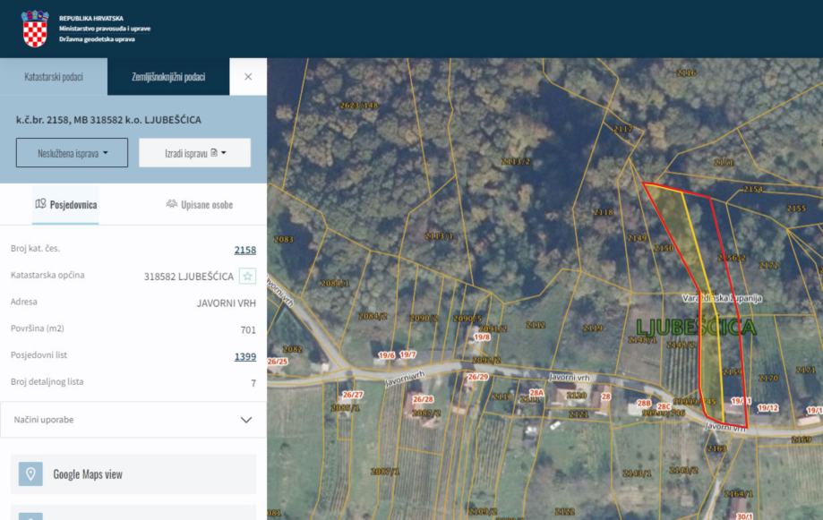 Zemljište sa zidanim i drvenim objektima nalazi se u vikend zoni općine Ljubešćica (Novi Marof) u ulici Javorni vrh. Zemljište se sastoji od tri parcele koje se nalaze jedna do druge. (pogledajte slike, sve tri parcele omeđene su crvenom bojom) Oko 800m2 zemljišta nalazi se u vikend zoni a ostatak je šuma.