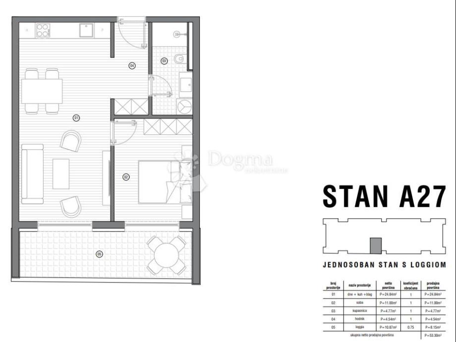 - stan A27, površina 53,30 m2, 1-soban, 4. kat