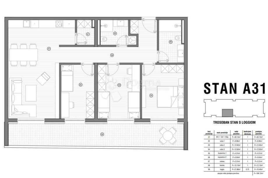 - stan A31, površine 106,12 m2, 3-soban, 5.kat