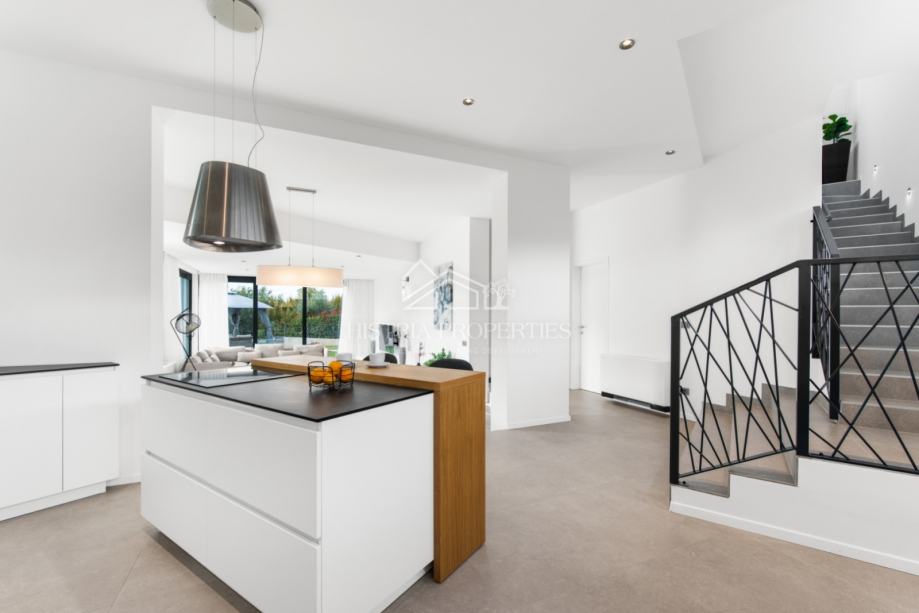 Moderan unutarnji raspored sa odličnom funkcijom sastoji se od kuhinje, blagovaonice i dnevnog boravka otvorenog tipa sa velikim staklenim stijenama koje vode na terasu i prostrani grijani bazen. U prizemlju još imamo spavaću sobu s luksuznom en-suite kupaonicom, zasebni toalet za goste i spremište.