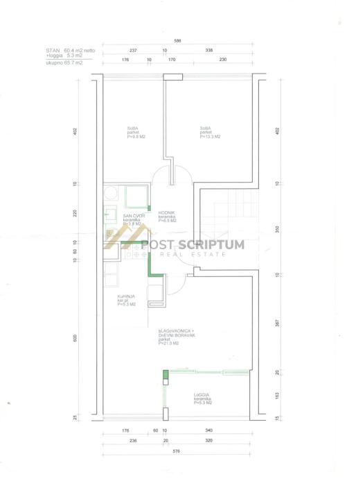 Sastoji se od ulaznog dijela (hodnika), kuhinje s blagovaonicom i dnevnim boravkom, dvije spavaće sobe, kupaonice i loggie.