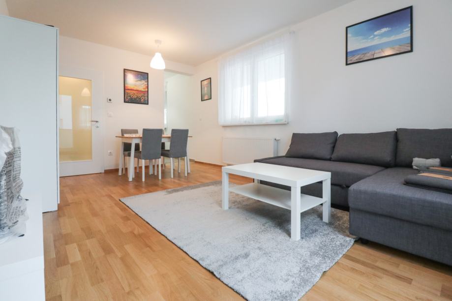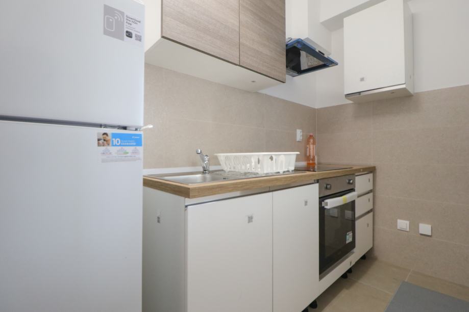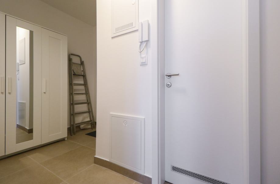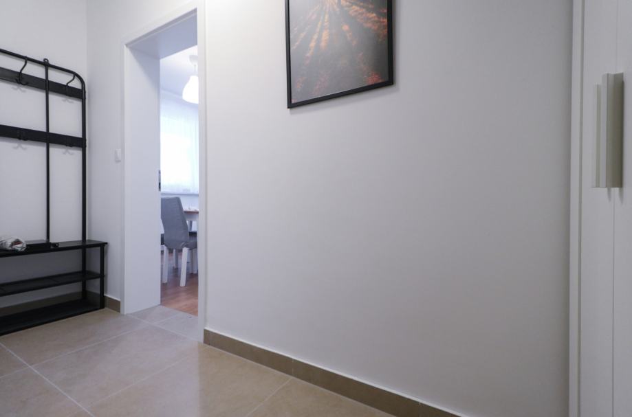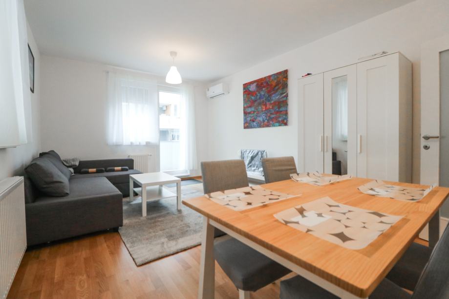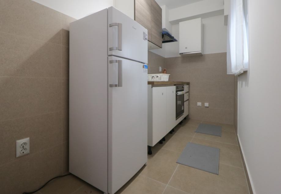 Stan je potpuno namješten i opremljen je klima uređajem, protuprovalnim vratima, PVC stolarijom, ormarima u sobi i u hodniku, ormarićem u kupaonici, TV-om, pećnicom, napom, hladnjakom sa zamrzivačem, indukcijskom pločom, video portafonom, udobnim kaučem na razvlačenje, tuš kabinom, toaletom i sl.