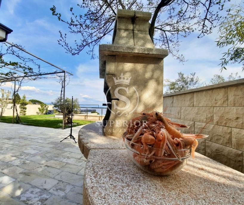 ✦ Vanjski prostor: djelomično natkrivena terasa, sunčalište, infinity bazen s pogledom na more, ograđena okućnica s autohtonim biljem i kamenim kaminom
