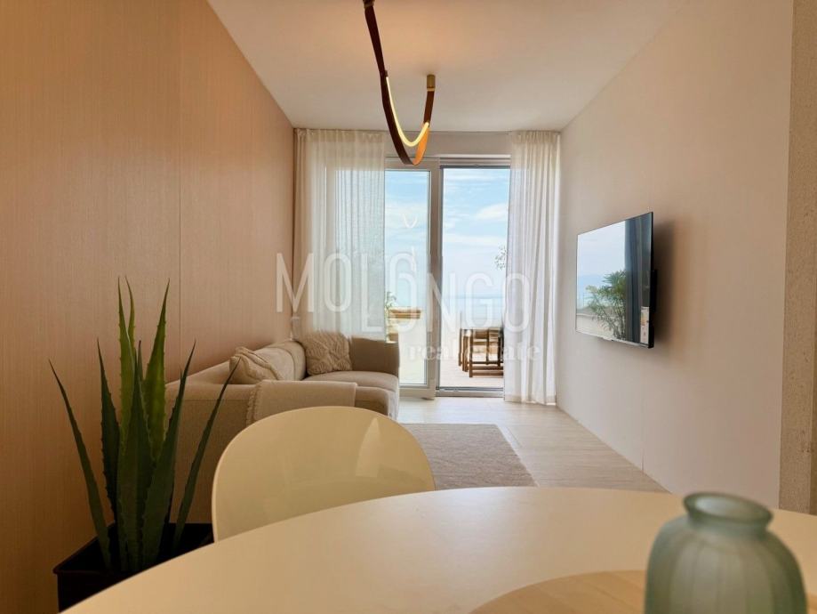 Stan se sastoji od ulaznog hodnika, dvije spavaće sobe, kupaonice, kuhinje i dnevnog boravka s izlazom na veliku terasu površine 42 m2 s koje se pruža prekrasan otvoren pogled na more.