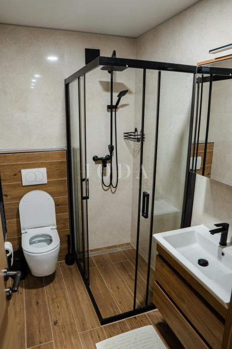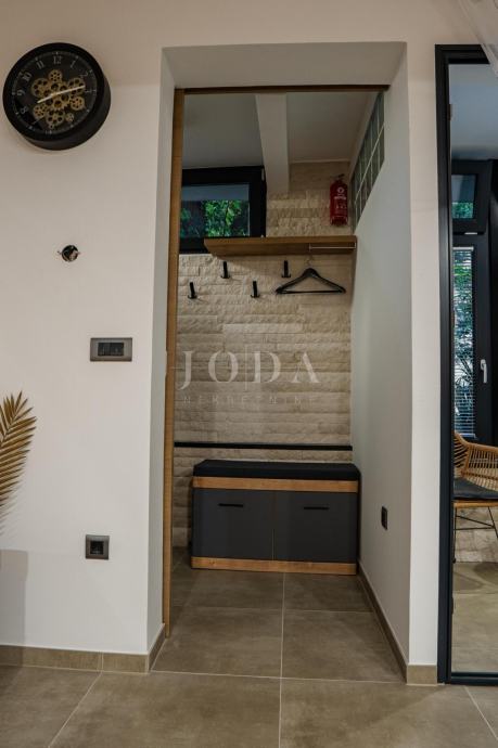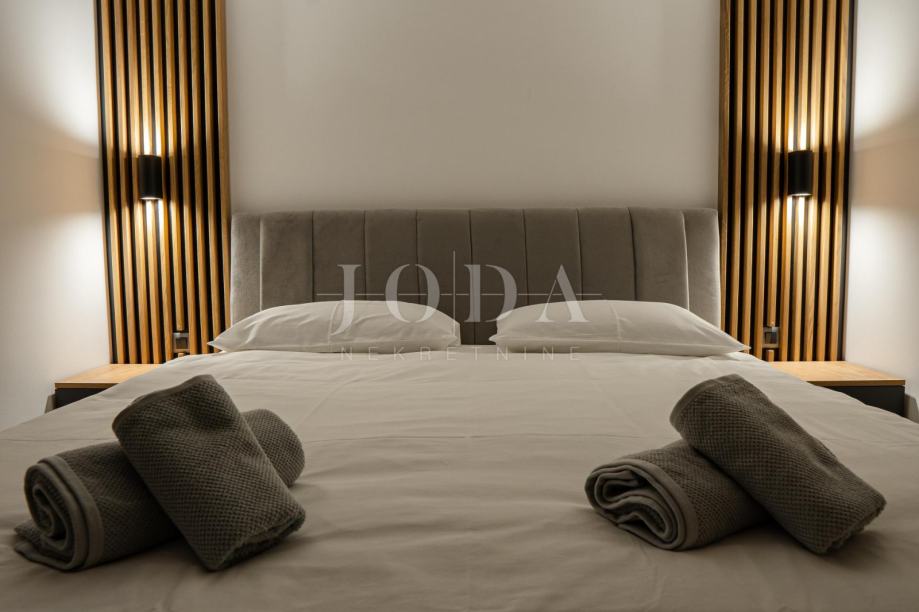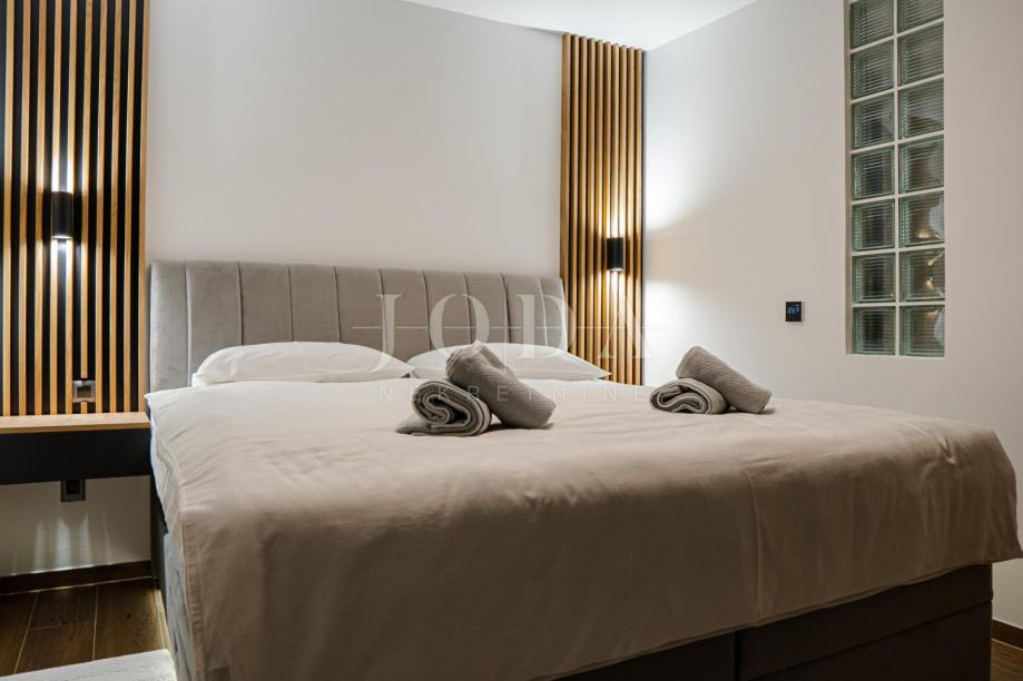 U suterenu objekta nalazi se kompletno uređeni i opremljeni apartman sa terasom od 12 m2, sa samostalnim izlazom na LUNGOMARE i more. Apartman se sastoji od spavaće sobe, dnevnog boravka sa kuhinjom, kupaonice i kupatila, terasa i spremište. Apartman je kompletno opremljen i kategoriziran, instalirano podno grijanje i klima uređaji.