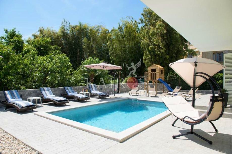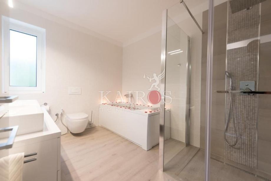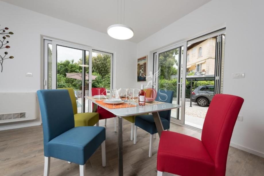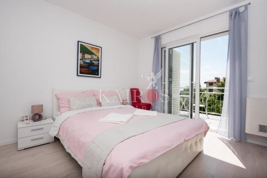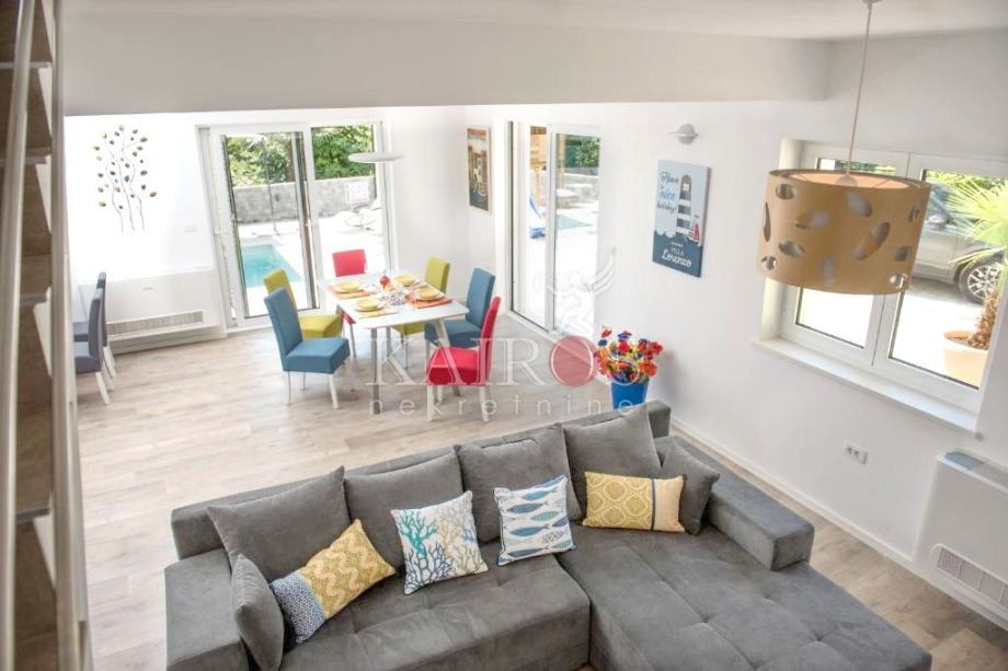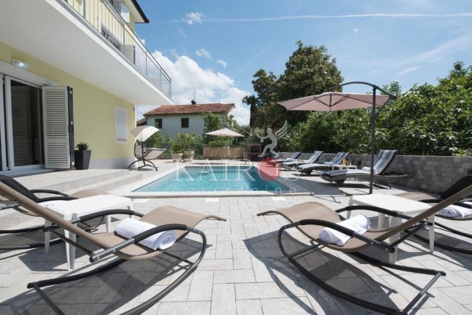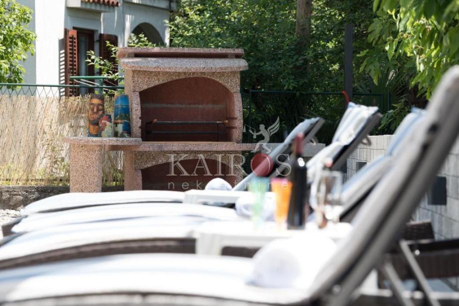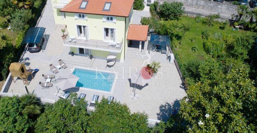 LOVRAN, iznajmljujemo cijelu kuću s ograđenom okućnicom i bazenom. Kuća ima prizemlje i kat, površine je 180 m2, a sastoji se od 4 spavaće sobe, 5 kupaonica (svaka soba ima svoju kupaonicu), dnevnog boravka, blagovaonice i kuhinje. Iz dnevnog boravka izlaz na popločani dio dvorišta s pogledom na bazen. Parkirna mjesta za dva automobila i još dovoljno javnih parkirnih mjesta uz okućnicu.