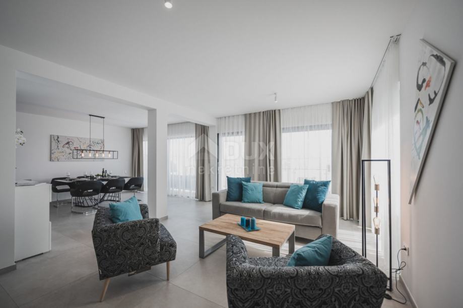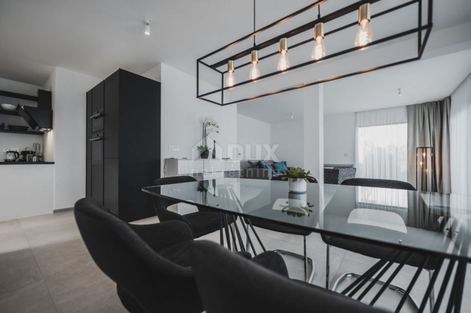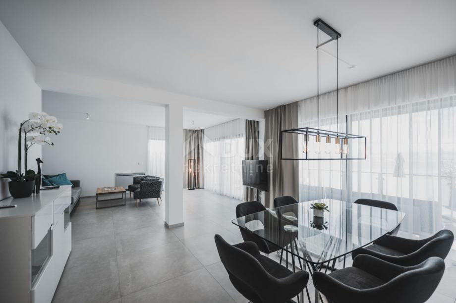 Stan je ukupne površine 120m2+terasa 26m2, a sastoji se od ogromnog dnevnog boravaka, kuhinje, blagovaone, dvije sobe svaka sa svojom kupaonom i WC-a za goste.