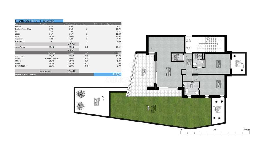 Ovaj prekrasan stan je dizajniran za maksimalnu udobnost i luksuz. Na raspolaganju su vam hodnik, WC, prostrani dnevni boravak s kuhinjom i blagovaonicom s izlazom na veliku terasu s pogledom na more, dvije spavaće sobe s vlastitim kupaonicama. No, ono što ovaj stan čini posebnim jest velika vrtna terasa i vrt - idealno mjesto za druženje s obitelji i prijateljima.