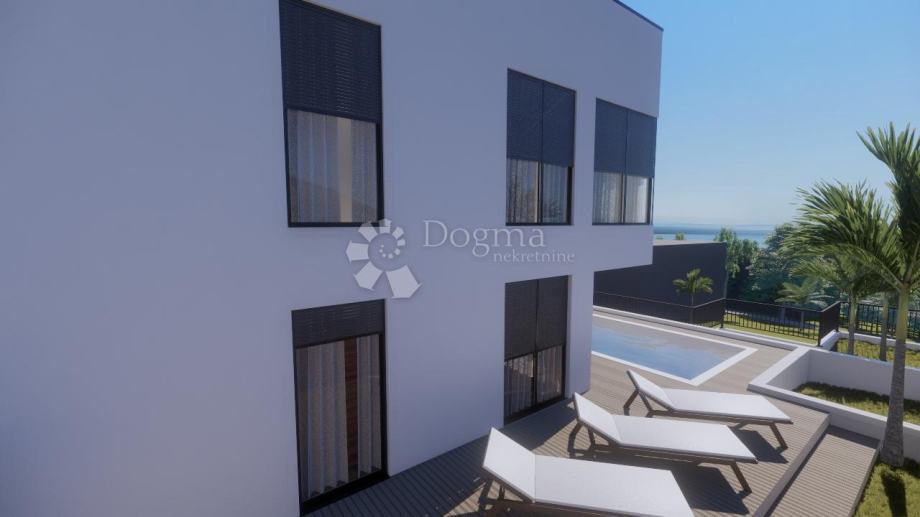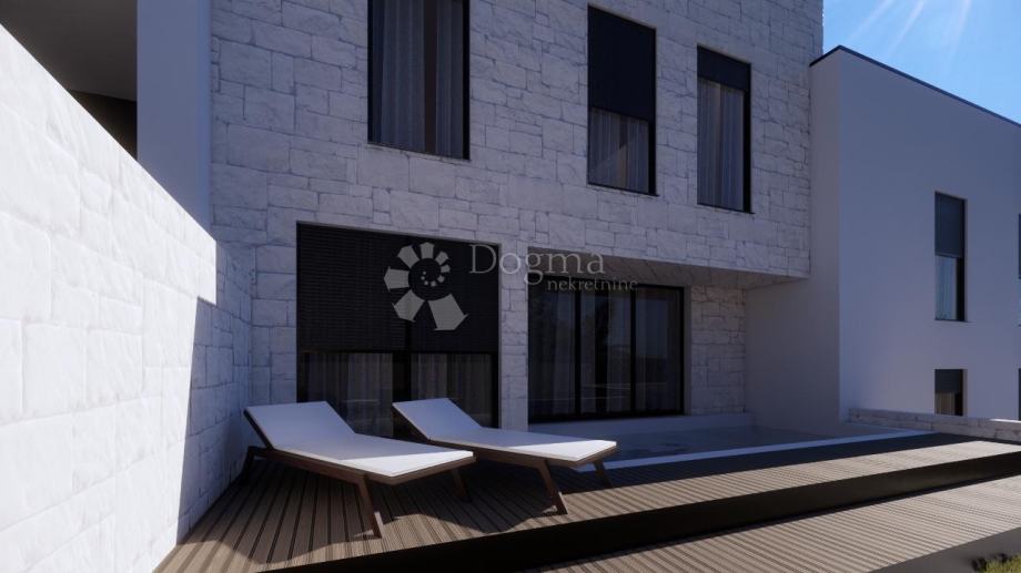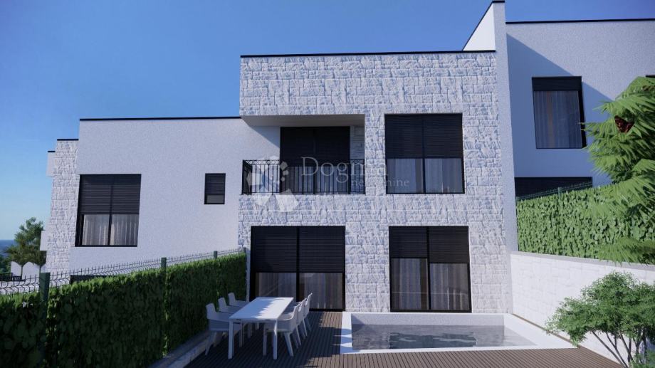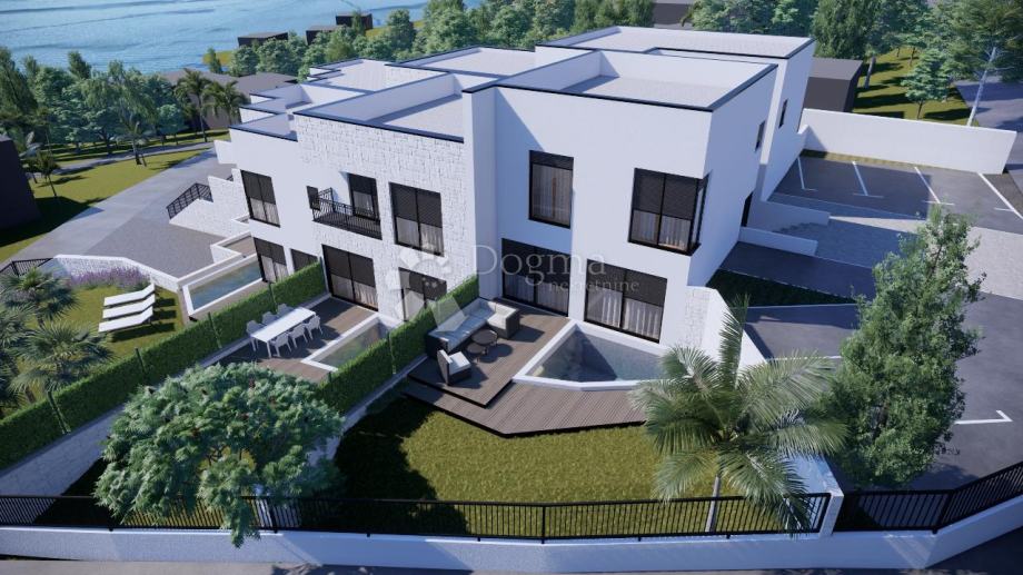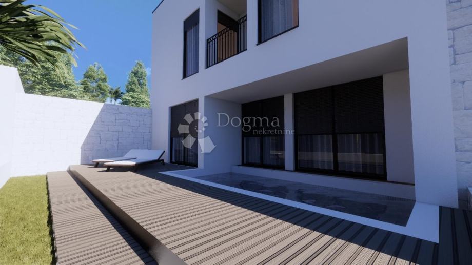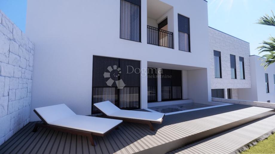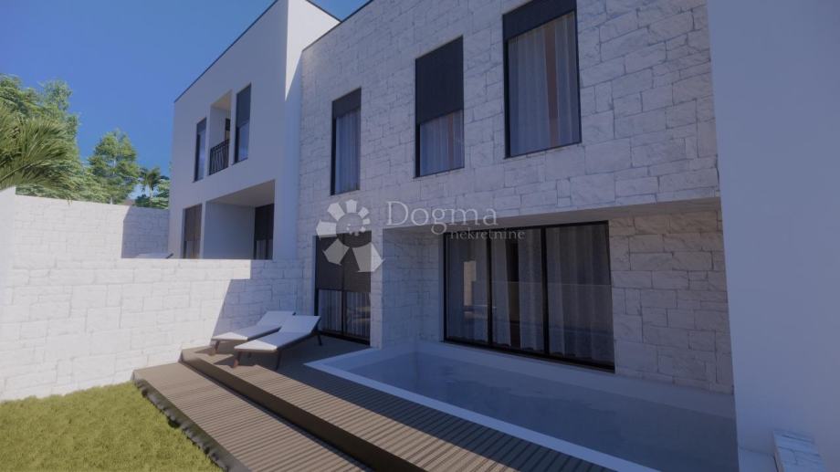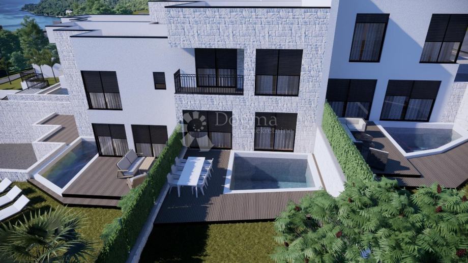 Na prvoj etaži imamo open space dnevni dio s kuhinjom, trpezarijom, dnevnim boravkom i terasom na kojoj je sunčalište s mini bazenom.
