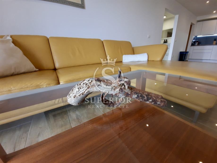Prostor interijera odiše prozračnošću i skladom – dvije spavaće sobe, dodatna soba, otvorena kuhinja s blagovaonicom i dnevnim boravkom, izlazi na terasu koja se stapa s vrtom ispunjenim maslinama, borovima i autohtonim voćkama. Tu je i elegantna kupaonica s walk-in tušem, dodatni toalet te praktičan hodnik koji vodi kroz cijeli stan. Sve je opremljeno vrhunskim, po mjeri rađenim namještajem i kućanskim aparatima, spremno za useljenje bez ikakvih ulaganja.