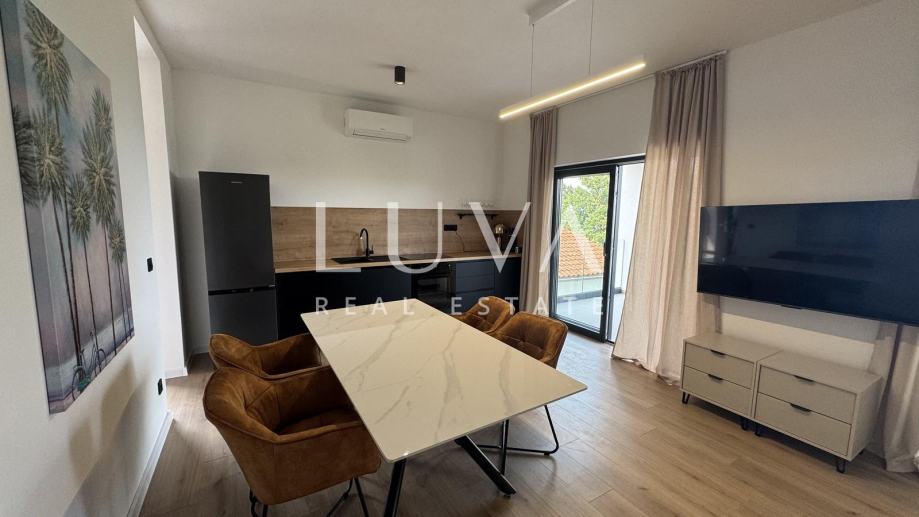Veličina stana je 90m2. Stan se sastoji od 2 spavaće sobe, blagovaonice s kuhinjom i prostranog dnevnog boravka s izlazom na terasu. Uz stan dolazi jedno parking mjesto.