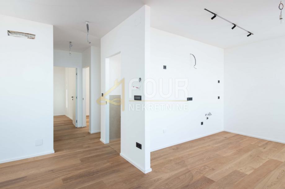 Stan je ukupne površine 77.17m2, uz terasu od 15.47m2 (od čega je 9.11m2 natkriveni dio), okućnicu od 49.56m2, dva parkirna mjesta (garažno mjesto od 16.76m2 i vanjsko mjesto od 10.50m2) te spremište od 21.30m2.