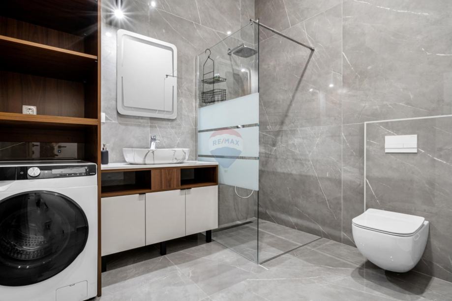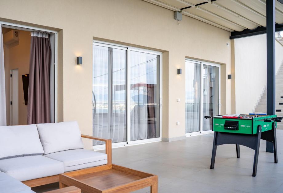 Sastoji se od dvije sobe, kupaonice, toaleta, kuhinje s blagovaonicom i dnevnim boravkom te velike terase sa sunčalištem i roštiljem. Parkirno mjesto je osigurano.